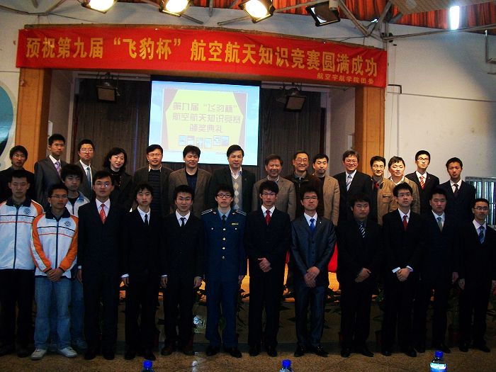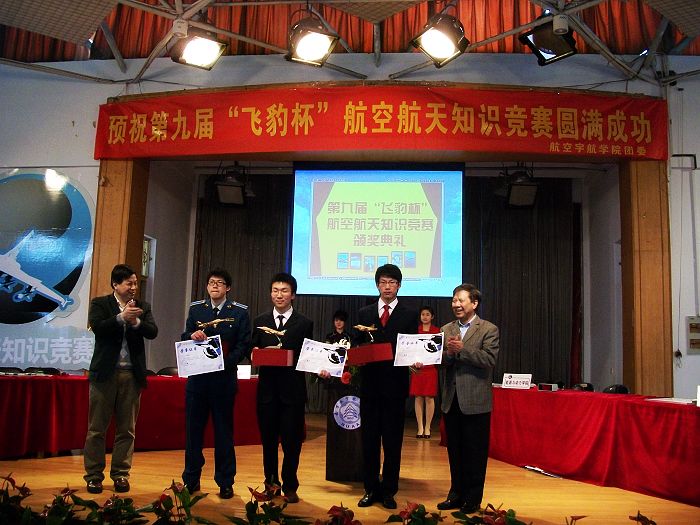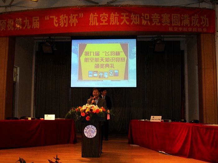 最后,沈长河书记为冠军航空宇航学院代表队颁奖并致辞――首先他表明此次“飞豹杯”航空航天知识竞赛非常成功,并对获奖学院表示祝贺,对南航学子的知识渊博感到欣慰,而学院的高度关注、员工的积极参与让他感到未来我国航空航天事业的希望。他还鼓励同学们一起努力,营造南航航空航天的良好氛围,激发大家对知识的探索发现能力。
