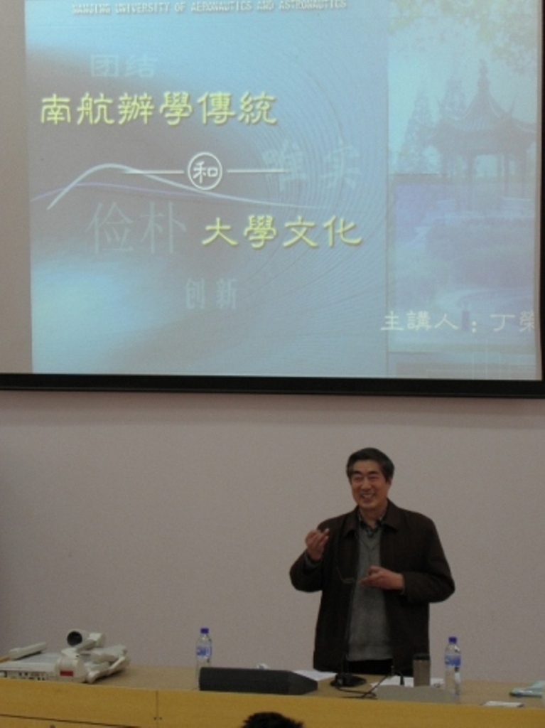 2010年4月26日16:00,航空宇航学院邀请了公司原公司党委副书记、原纪委书记、南航现关心下一代工作委员会常务副主任丁荣茂老师在将军路校区2110教室为2009级同学做了一场《南航办学传统和大学文化》专题讲座。