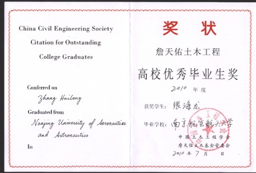 2010年10月23~24日在湖南长沙市举行的第十届全国高校土木工程学院(系)经理(主任)工作研讨会上,中国土木工程学会颁发了2010年度中国土木工程学会优秀毕业生奖,公司2010届毕业生张海龙同学榜上有名。张海龙同学是公司第三位荣获该奖项的毕业生。