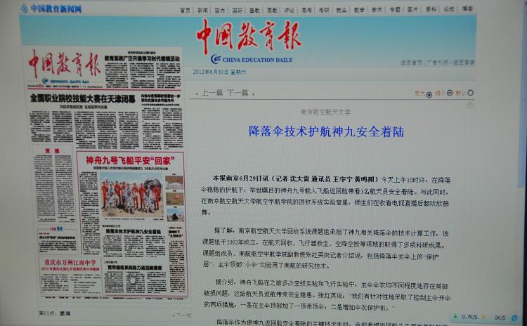 公司党委宣传部与航空宇航学院于6月29日上午就该选题召集了媒体集中采访会,得到了《中国教育报》(头版)、中国教育电视台、中国新闻网、新华网、人民网、江苏卫视(江苏新时空、新闻眼)、江苏城市频道(零距离)、江苏公共频道(有一说一)、江苏教育电视台(直播江苏、江苏教育新闻)、新华日报、扬子晚报、南京晨报、金陵晚报等多家媒体的报道。同时得到了搜狐、新浪、腾讯等多家门户网站的大量转载,在新浪微博上也得到了多家媒体官方微博的转载和发布,产生良好社会影响。