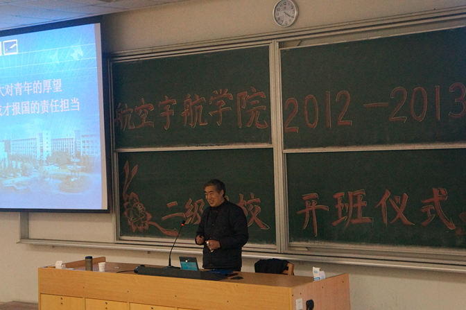 12月17日下午四时,航空宇航学院2012―2013学年二级团校开班仪式暨第一次授课在将军路校区4102教室拉开帷幕。开班仪式由航空宇航学院团委书记、11级辅导员储瑾蓉老师主持,11级辅导员许俊勇老师、12级辅导员卢一亭老师、学院员工干部和大一、大二年级的年级、班级的骨干们都参加了本次开班仪式。校关心下一代工作委员会常务副主任丁荣茂老师受邀参加,并为同学们做第一次授课。