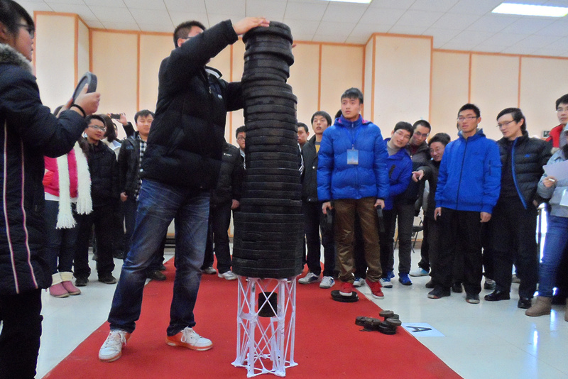 经过前期的预赛比拼,共有三十支队伍近百人进入决赛,开赛后主持人首先介绍了比赛的流程及规则。赛中第一轮就出现了高水平作品,B组第一个作品承重超过200公斤,经过3个小时的激烈角逐,“土木之队”等15支队伍分别斩获了特、一、二、三等奖,其他队伍也分别获得了造型风采、结构创新等优胜奖。“六芒星”团队的作品获得“最佳承重奖”,承重达300公斤。