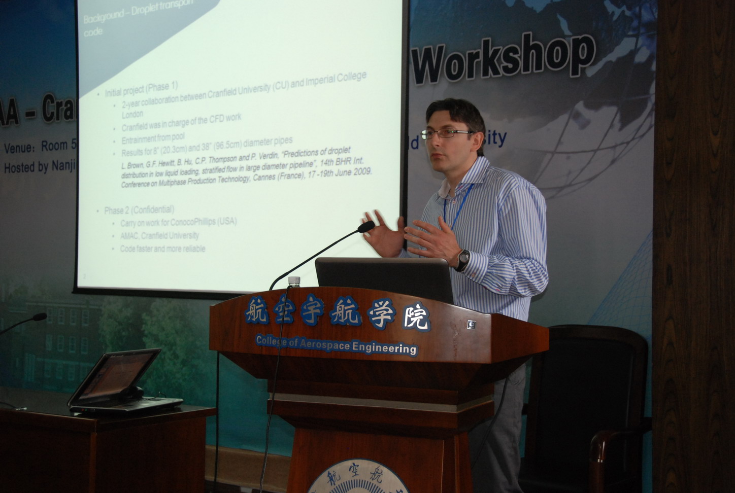 会议期间, 公司与Cranfield大学就国内外航空航天领域热点关注的飞行器结冰,飞行器结构与载荷,优化设计等诸多领域展开了深入广泛的交流。其中英国Cranfield大学Rade教授做的关于超大载荷作用下的结构受力以及复合材料与结构设计的两个报告,深入浅出的介绍了Cranfield大学在该领域的先进研究成果与技术,为南航师生上了一堂生动的课。而公司的朱春玲教授代表她们的研究团队,做了飞行器结冰数值与实验研究的报告,该报告得到了Cranfield大学同行的一致好评。会后两个研究团队还就飞行器结冰的诸多难点进行了进一步深入的讨论。