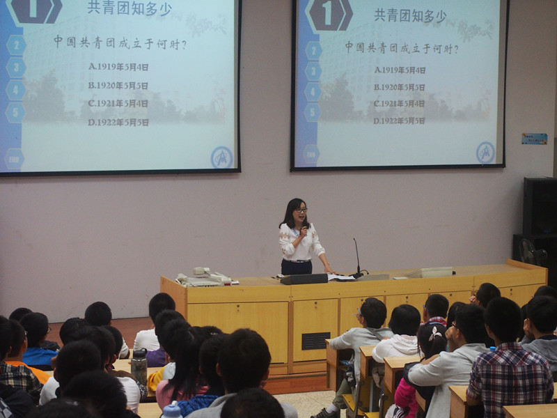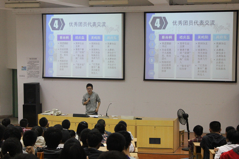 主讲人储瑾蓉老师精心准备,首先用“共青团知多少”趣味竞答的新颖形式,形象的介绍了共青团的发展历程,引发了新生的浓厚兴趣。随后从学习、参与、爱国、团结等六个方面详细解读了“团员之责”,鞭策新生在共青团的引导和帮助下,积极奋斗,自我成长。同时以“团员之权”为新生详尽介绍校、院各级团学组织为青年团员提供的多样化成长平台。如何实现成长?团课上专程邀请了院团委副书记蔡雨桐、院员工会主席稽庆磊等4名优秀的团员代表,带来了他们从新生团员成长为实践先锋、员工领袖,科创达人,志愿使者绽放精彩的历程,也再次点燃了全场同学追逐梦想的热情。