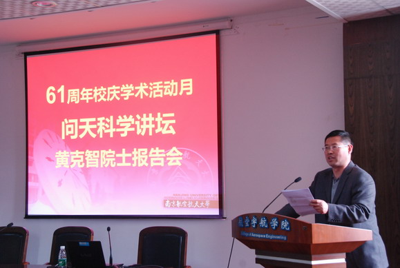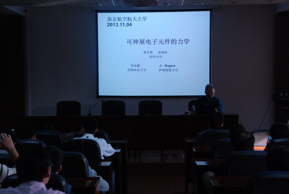 访问期间黄院士做了题为“可伸展电子元件的力学”的学术报告,详细介绍了他与合作者近年来在柔性电子器件力学方面所取得的研究成果,以及在应变梯度理论及纳米力学等方面的研究工作,引起广大师生的浓厚兴趣。航空宇航学院经理赵宁教授主持了报告会,全校师生一百余人参加了报告会。