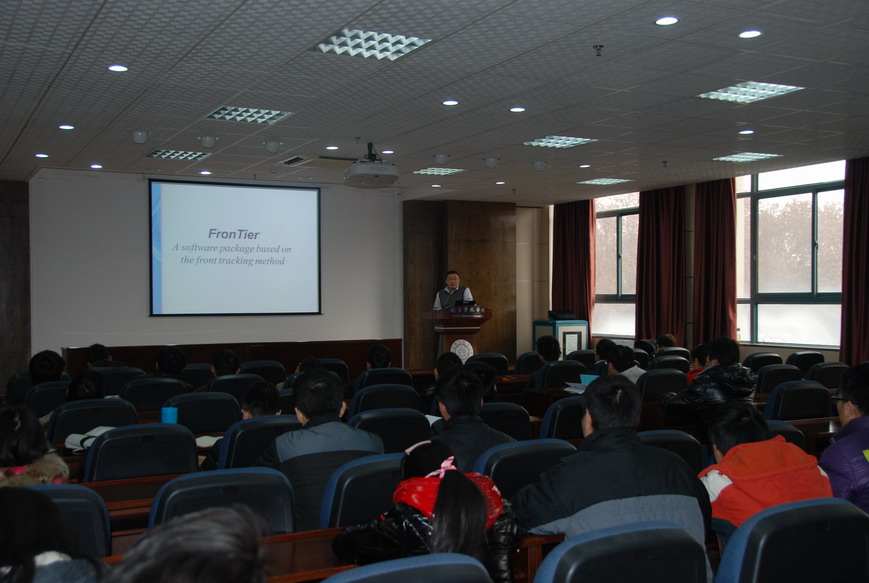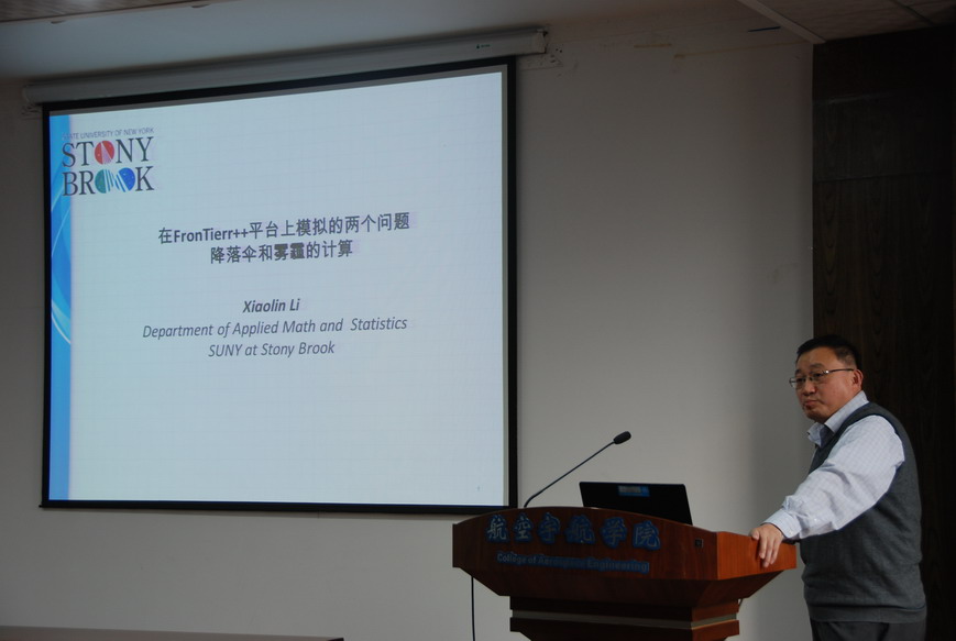 访问期间,李晓林教授做了题为“在FronTierr++平台上模拟的两个问题――降落伞和雾霾的计算”的学术报告。报告介绍了一种建立在弹簧三角网格上的新的降落伞建模,由此带来的数值理论问题和他们的解,以及在此基础上建立的降落伞计算模拟,它的数值收敛性以及对某些实验结果的验证;并介绍了大气水颗粒和其他颗粒的动态模拟,该模拟将可能加深对雾霾形成和它随各种大气参数变化的理解以及如何预测和控制,建立理论基础和计算平台。报告结束后,现场老师和员工就报告内容进行了积极讨论。航空宇航学院科研副经理朱春玲教授主持了报告会。