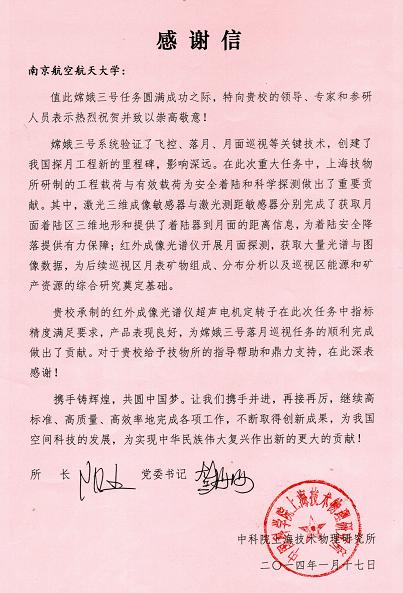 中科院上海技物所致信感谢公司为嫦娥三号所作贡献