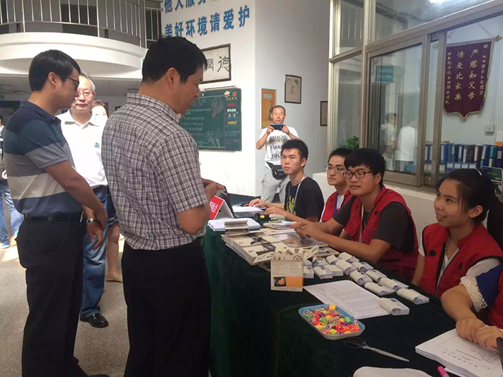 随后校领导们还一起检查了迎新报到工作,并与现场的志愿者们进行了亲切地交流。当看到学院为迎新期间过生日和整百报到的新生准备特殊礼物、为每一位新生制作了一本“新生护照”以尽快适应老员工活时,郑书记频频点头。书记说,在大学里不仅要学习科学知识,还要注重人文素养的提升,要让员工多读书。当新生邀请郑书记共同合影留念时,书记欣然应邀。