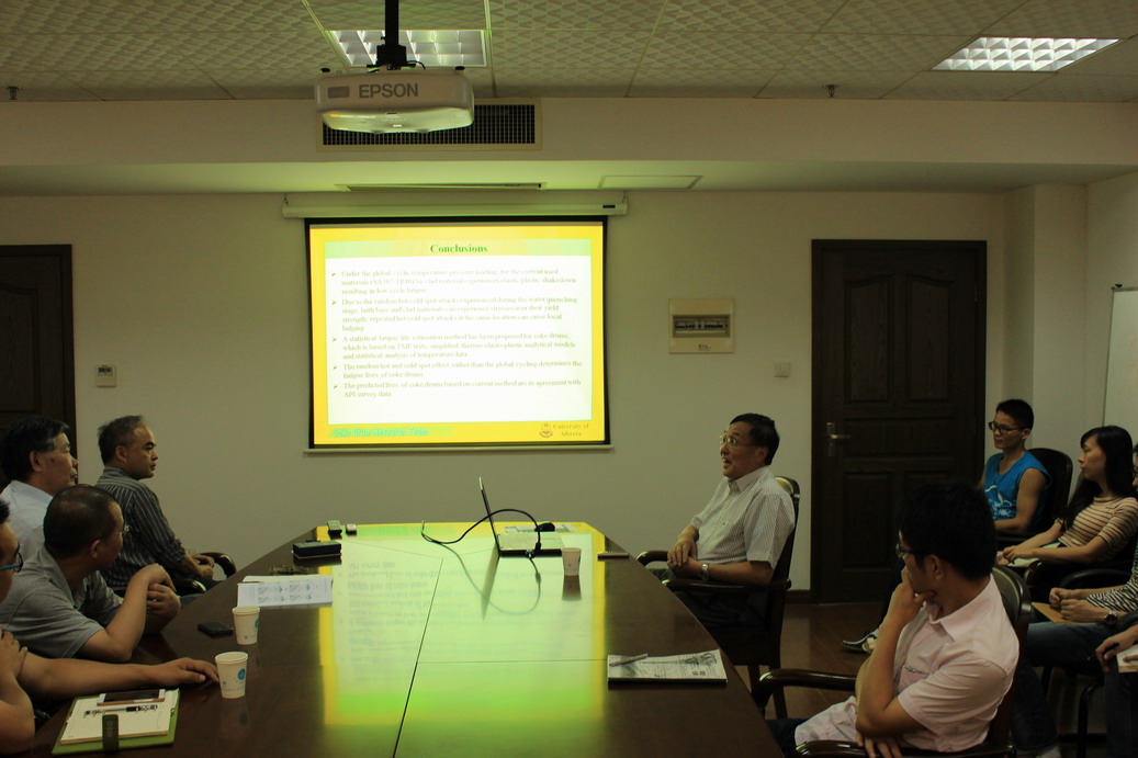 夏子辉教授介绍了阿尔伯达大学在压力容器损伤分析、探测领域的研究工作,特别是他们课题组在复合钢板高温压力容器损伤表征、机理分析、探测方案、优化措施等方面的系列工作。报告结束