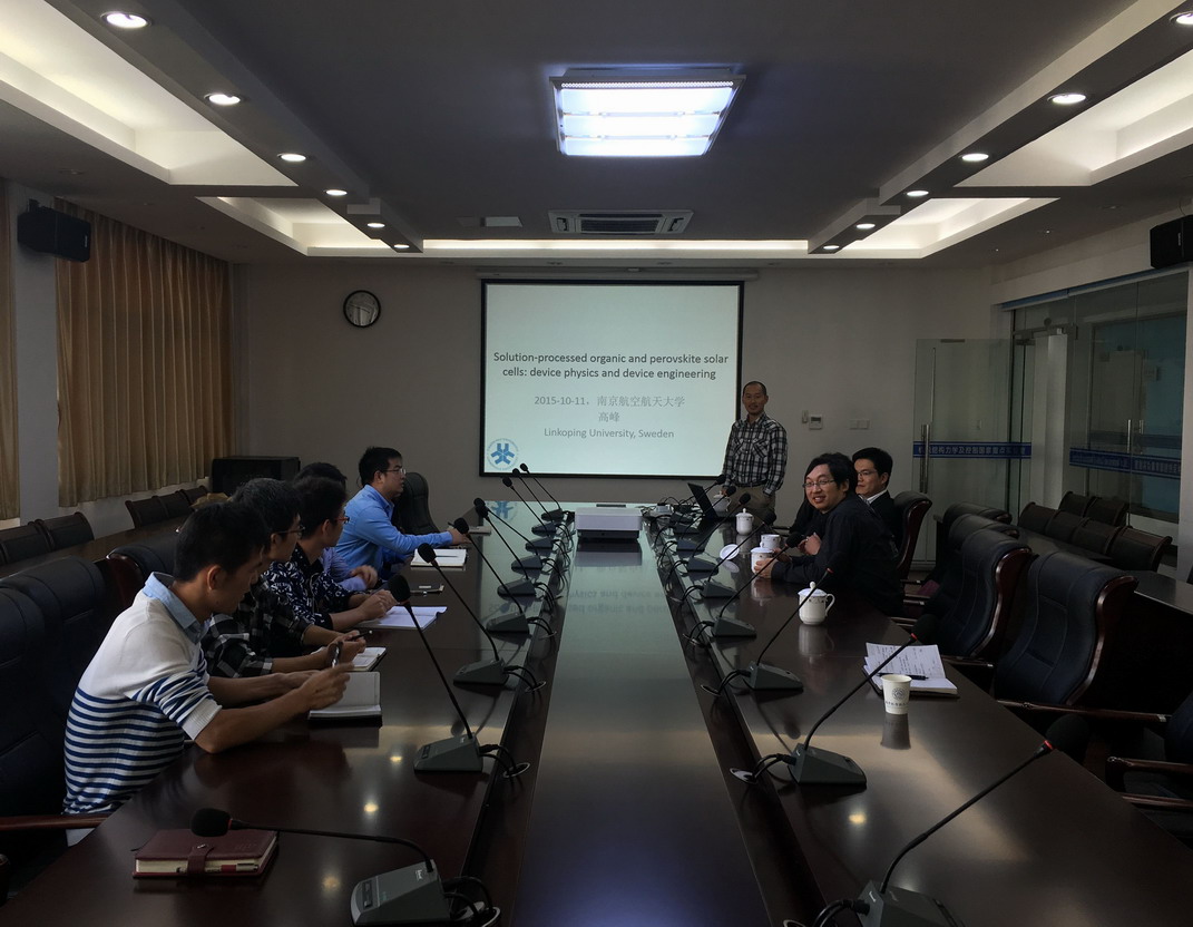 应公司机械结构力学及控制国家重点实验室杨颖教授邀请,瑞典林雪平大学高峰博士于2015年10月11日至14日访问了公司,并于10月11日为公司师生做题为“Solution-processed organic and perovskite solar cells:device physics and device engineering”的学术报告。