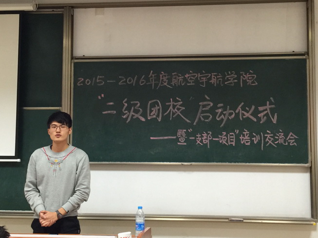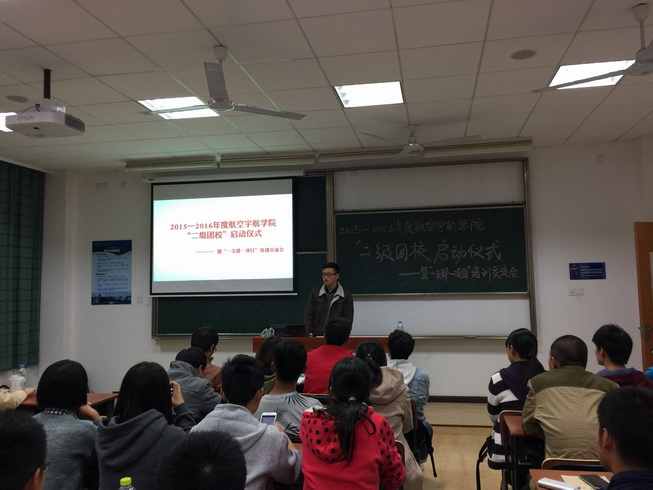 2015年11月1日晚,2015年航空宇航学院“二级团校”启动仪式暨“一支部一项目”培训交流会在D3307如期举行。14级、15级团总支,各班团支书参与了本次活动。