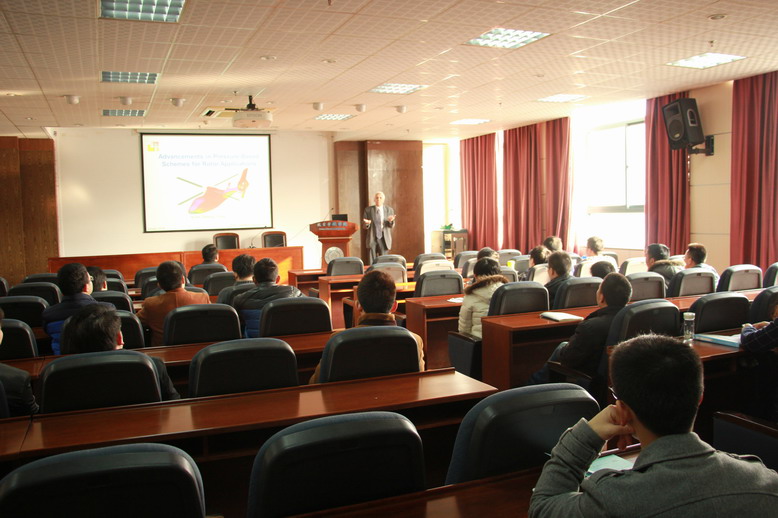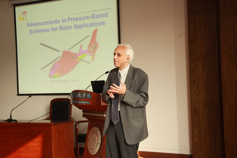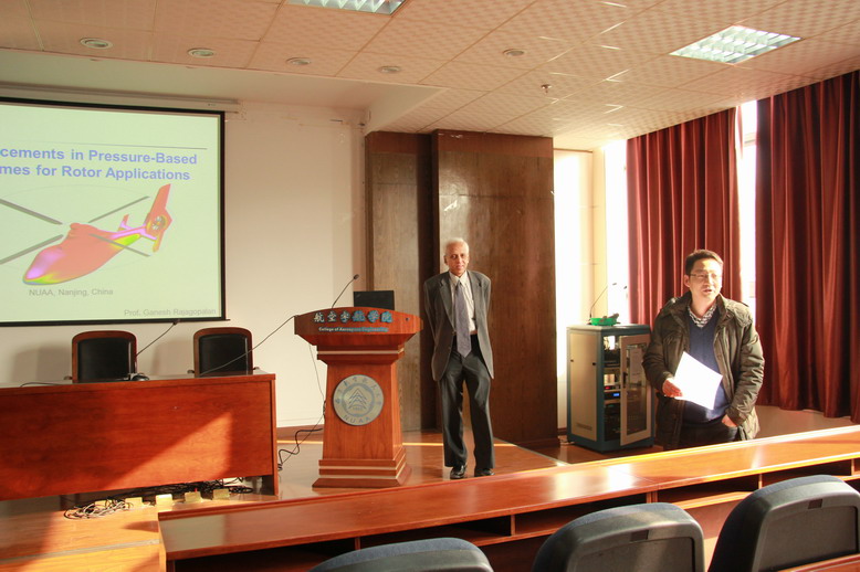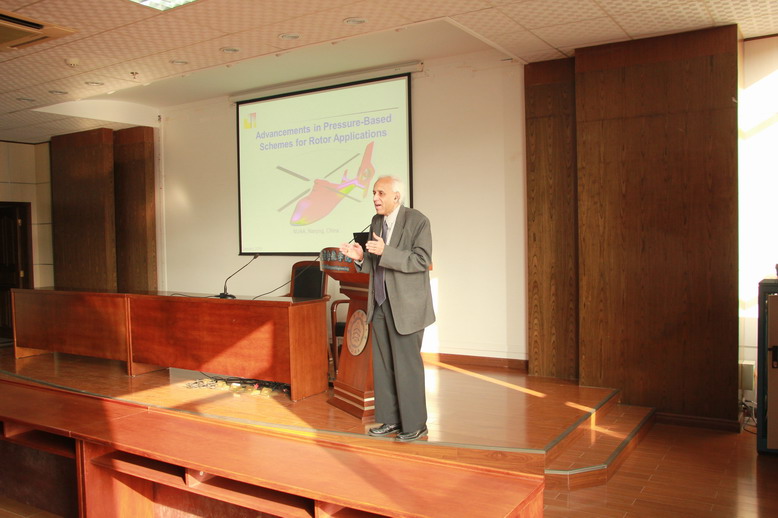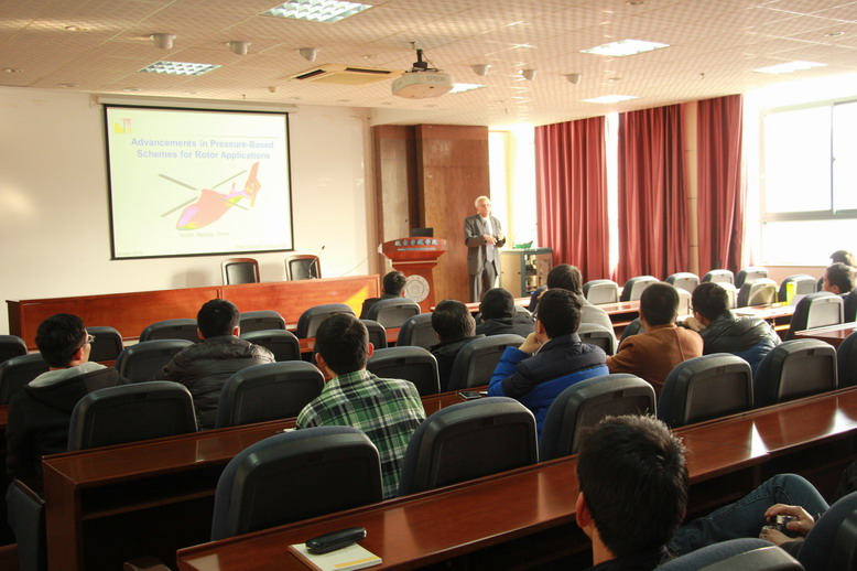 报告介绍了他在直升机机舰耦合、编队飞行及直升机沙盲问题等方面CFD应用领域最新研究工作;同时,Ganesh教授还结合自己多年的研究经历,讲述了动量源方法的起源和优势,该方法的处理技巧及在直升机、风力机和螺旋桨等领域的应用情况。参会的老师和研究生们就当前直升机完全CFD及动量源方法的应用现状、技术细节及优缺点对比了进行了热烈的讨论,给Ganesh教授和参会的师生们留下了深刻的影响。