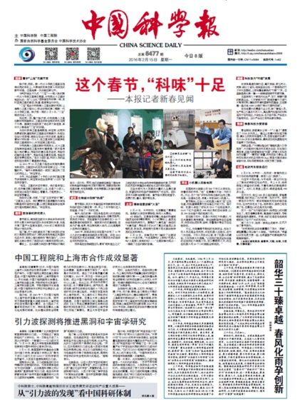 2016年2月15日,在《中国科学报》在其春节后第一期报纸头版上,集中报道了春季前后不同地方和行业科研单位的工作,其中就报道了公司纳米科学研究所的科研进展。
