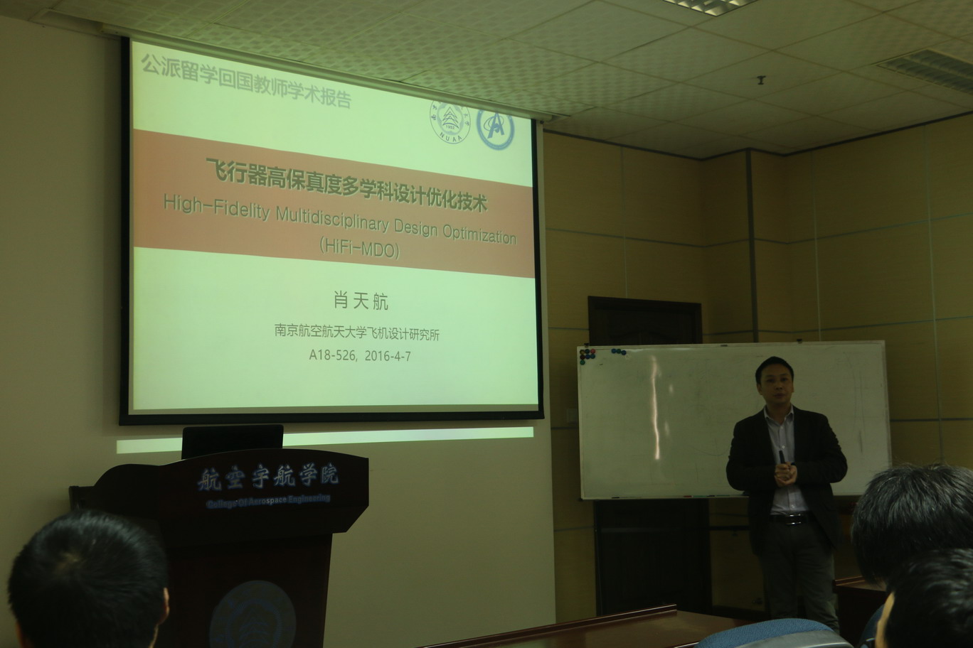 按照校人事处关于公派留学回国教师的要求,航空宇航学院飞行器系肖天航副教授于2016年4月7日为公司师生作了题为“飞行器高保真度多学科设计优化技术”的学术报告。报告总结了其在留学期间所开展的气动数值模拟方法方面的研究工作;结合国际发展动态,介绍和评述了飞行器高保真度多学科设计优化技术及研究现状、面临的挑战和发展趋势。