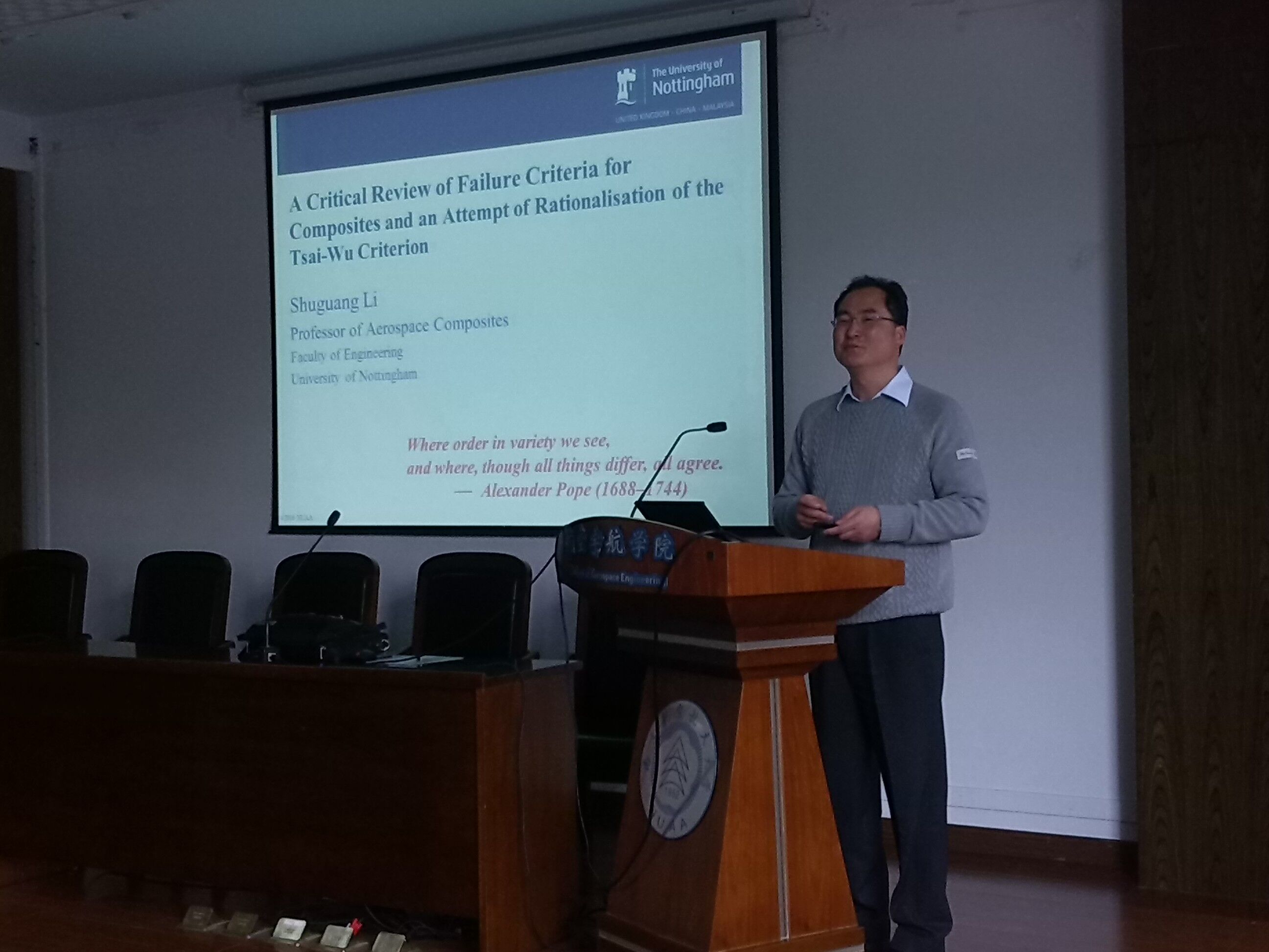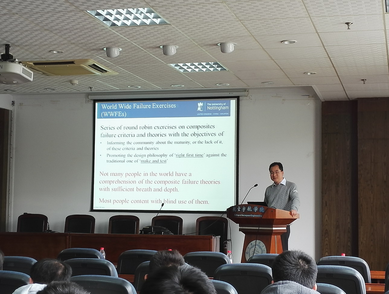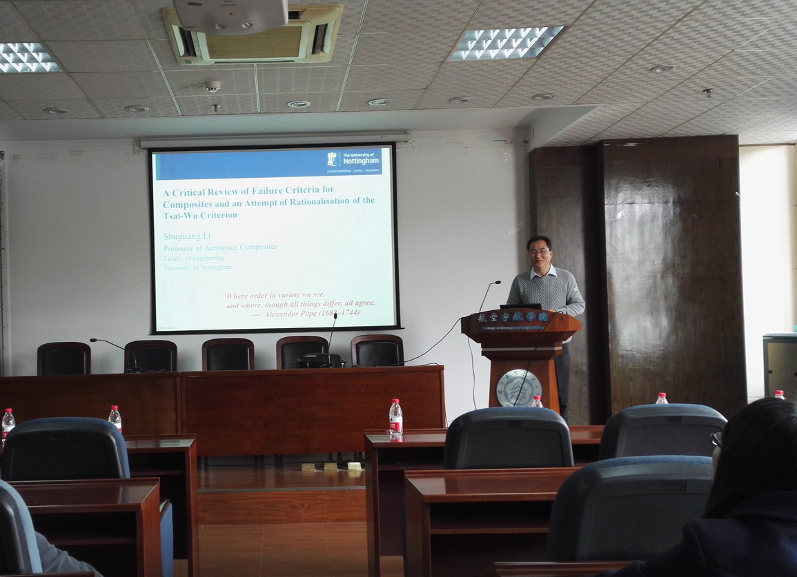 应公司直升机旋翼动力学国家级重点实验室主任夏品奇教授邀请,英国诺丁汉大学航空宇航技术研究中心李曙光教授于2016年4月5日至6日来公司学术访问,并于4月5日为公司师生做了题为“A Critical Review of Popular Failure Criteria for Composites”的学术报告。报告介绍了现行复合材料疲劳破坏准则的适用性和不足,以及报告人自己在该问题上的新发现和成果。航空宇航学院副经理沈星教授主持了报告会。