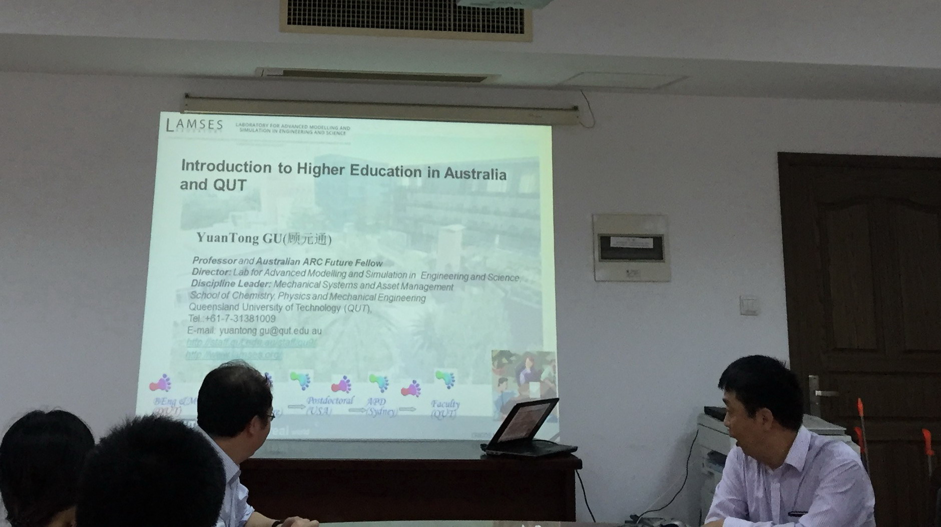 应公司机械结构力学及控制国家重点实验室王立峰教授邀请,澳大利亚昆士兰科技大学化学物理与机械工程学院机械系主任顾元通教授于2016年5月24日至28日访问了公司,并于5月27日为公司师生做题为“Numerical and Experimental Exploration of Mechanical Behaviour of Layered Sodium Titanate Nanowire and a New Diamond Nanothread”的学术报告。报告内容丰富、生动、精彩,介绍了新型一维纳米结构的理论、计算和实验研究,对公司相关科研工作具有借鉴作 用。同时,还结合自己多年的教学、科研经历,讲述了研究生如何做好科学研究、Dynamics课程(对应国内理论力学课程的运动学、动力学部分)教学等若干问题。王立峰教授主持了此次报告会。