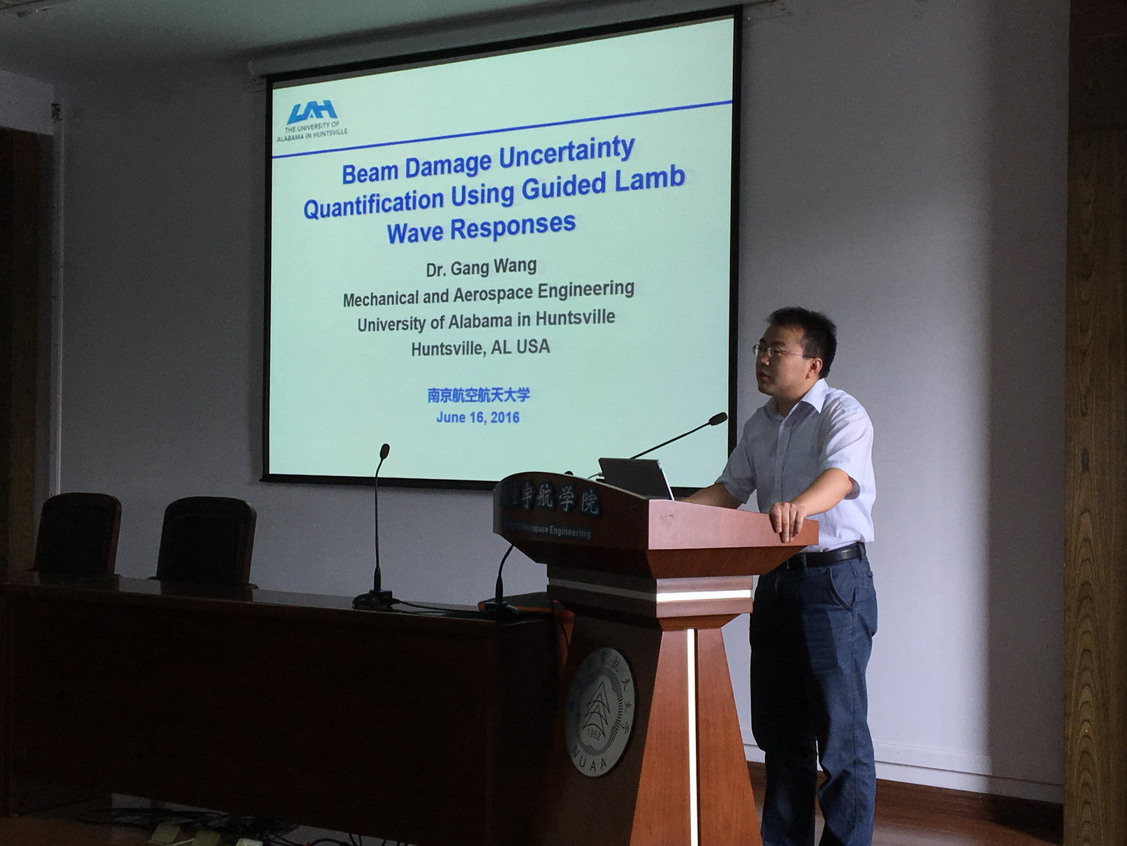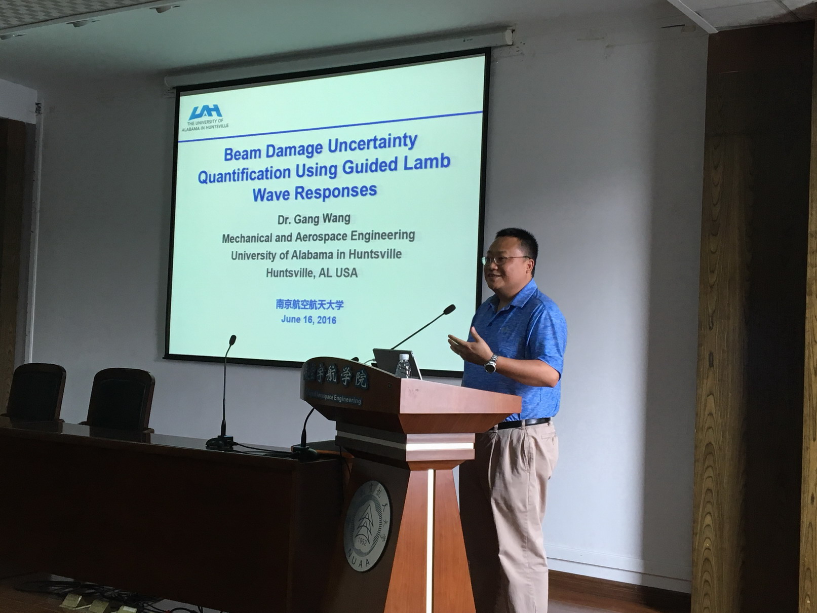 应公司直升机旋翼动力学国家级重点实验室副主任陈仁良教授邀请,美国阿拉巴马汉茨维尔大学机械与航空工程学院Gang Wang副教授于2016年6月16日访问了公司,并为公司师生做题为“Beam Damage Uncertainty Quantification Using Guided Lamb Wave Responses”的学术报告。报告内容丰富、生动、精彩,对公司相关科研工作具有借鉴作用。同时,Gang Wang副教授还结合自己多年的研究经历,讲述了直升机动力学及智能控制等问题。航空宇航学院副经理钱征华教授主持了此次报告会。