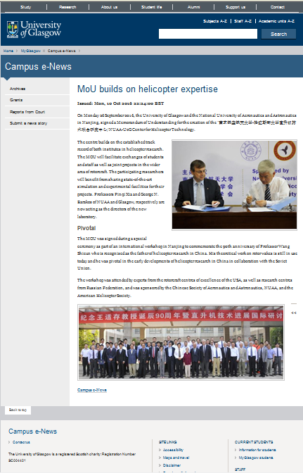 10月10日,英国格拉斯哥大学在网站上报道了与公司开展直升机合作的有关新闻。