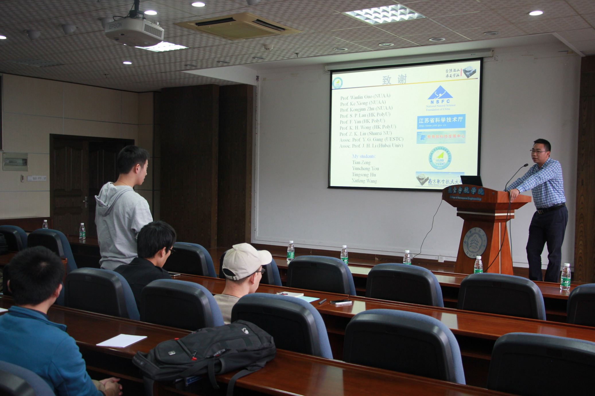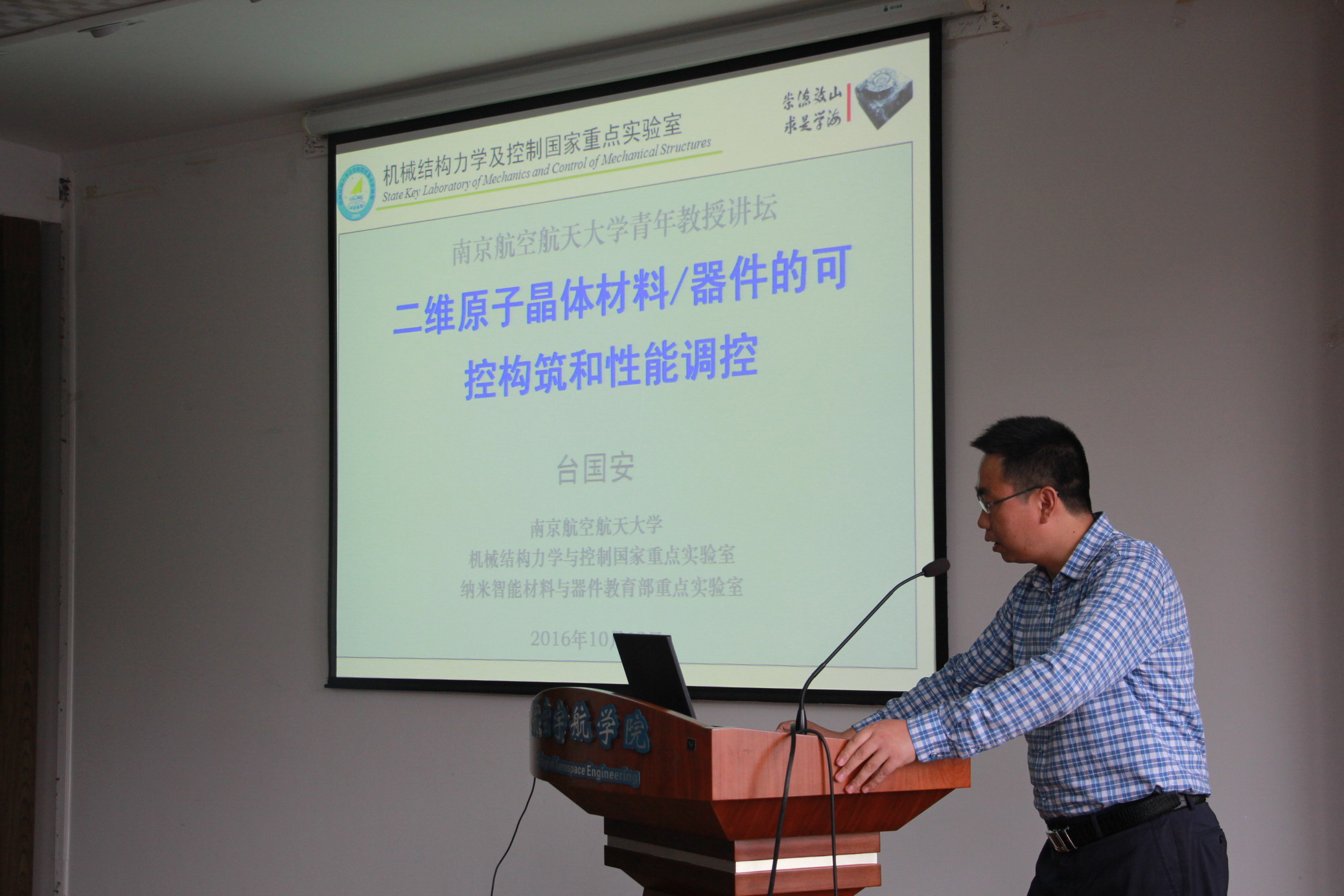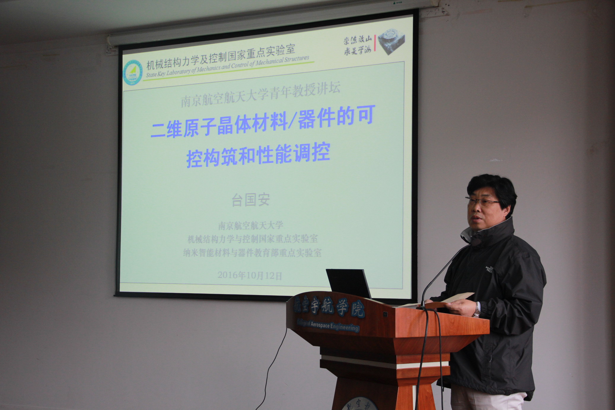2016年10月12日下午,公司航空宇航学院台国安教授受邀做客“青年教授讲坛”,在18号楼529报告厅做了题为“二维原子晶体材料/器件的可控构筑和性能调控”的学术报告。航空宇航学院常务副经理高存法教授主持了报告会,参加此次报告会的有来自全校相关专业的近40余位青年教师及员工。