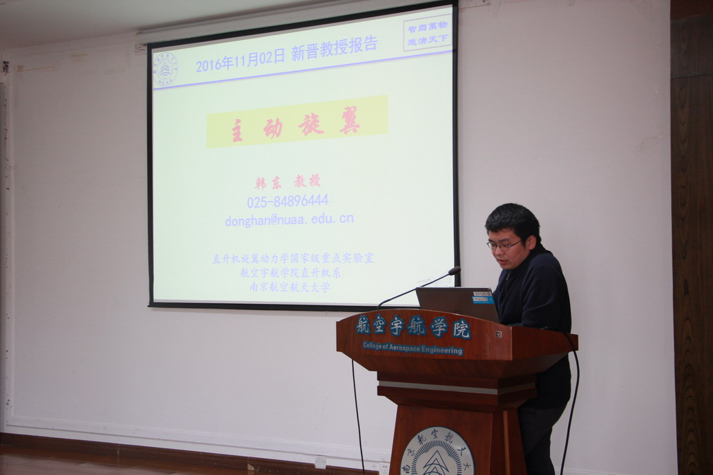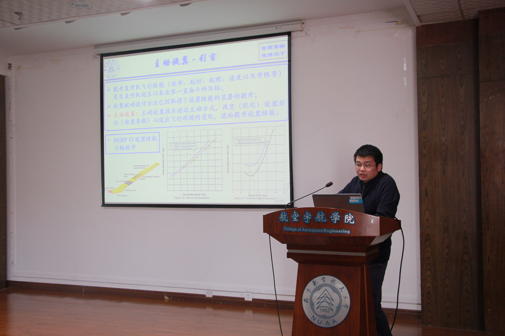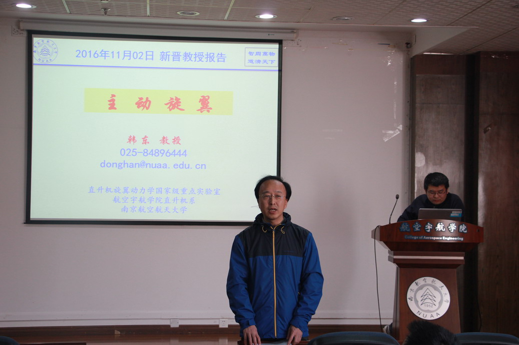 2016年11月2日上午,公司航空宇航学院直升机旋翼动力学国家级重点实验室韩东教授受邀做客“青年教授讲坛”,在18号楼529报告厅做了题为“主动旋翼”的学术报告。航空宇航学院李建波研究员主持了报告会,参加此次报告会的主要是来自全校相关专业的教师及员工。