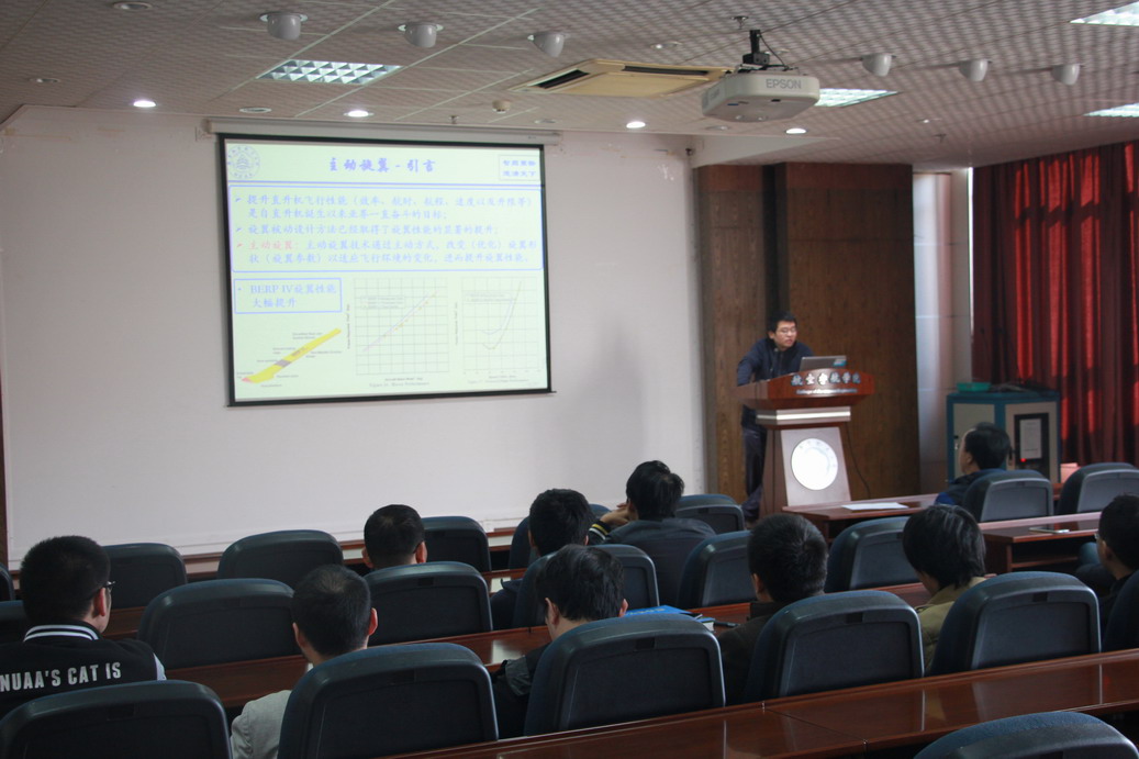 韩东教授的报告涉及旋翼技术的最新发展趋势与应用,主要讲述了主动旋翼的发展概况,重点探讨不同主动旋翼技术的发展趋势和最新成果,介绍了旋翼变转速、旋翼变直径、桨叶变扭转以及旋翼翼型变体等技术的应用研究进展。韩东教授报告深入浅出、精彩纷呈,与会师生普感获益匪浅。报告结束后,韩东教授与参会的青年科研工作者就一系列专业问题进行了深入的讨论,取得了良好的交流效果。