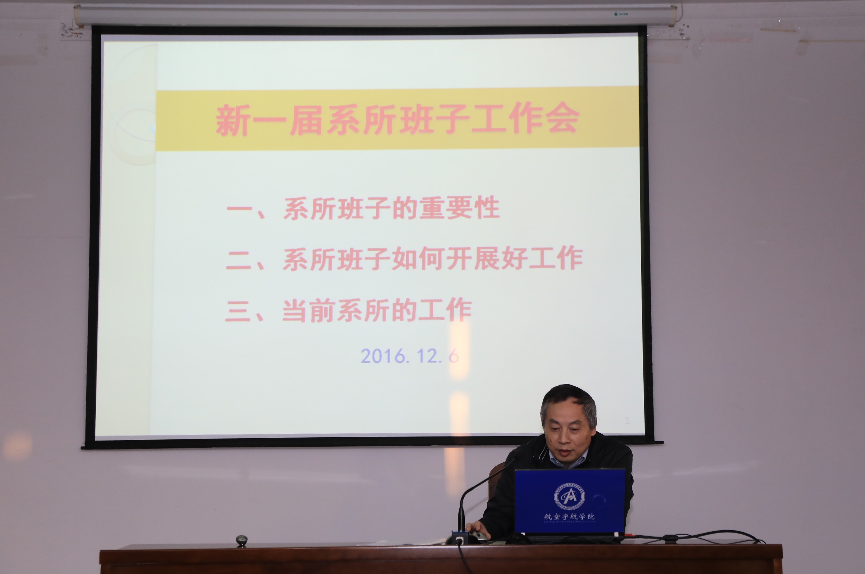 夏品奇经理在会上代表学院领导班子对新一届系所负责人表示祝贺,新一届系所班子是在学院出台《航空宇航学院关于加强系(所)领导班子建设的若干意见》基础上,通过广泛征求各单位教师意见,经民主推荐、组织考察、教职工测评和公司党政联席会讨论决定等环节产生的,被广大教职工寄予厚望。夏经理从三个方面谈了自己对新一届系所班子工作的思考,他首先强调了系所班子重要性,系所工作是是学院发展的依托,建设“世界一流学科、一流航空宇航学院”的目标和任务的实现,学院的发展战略及各项措施的落实最终要靠系所来落实。在推进“学院要发展”向“系所要发展、教师要发展”的转变过程中,系所工作发挥着重要的作用。系所班子是系所的核心、是系所的领导集体,因此,系所班子工作的好坏直接影响到系所工作的好坏。随后他对系所班子如何开展工作也提出了具体意见,希望系所领导班子能够团结一致,要有奉献精神和责任意识,要坚持民主集中制,要尊重广大教师,善于调动大家的积极性,在工作中一定要做到清正廉洁。最后,夏经理要求大家认真学习领会学院综合改革方案精神,总结本单位2016年度工作,组织大家充分讨论制定2017年度工作计划。