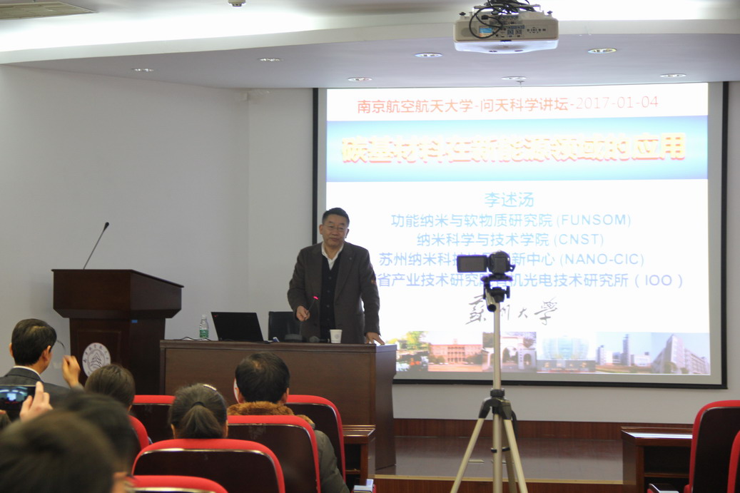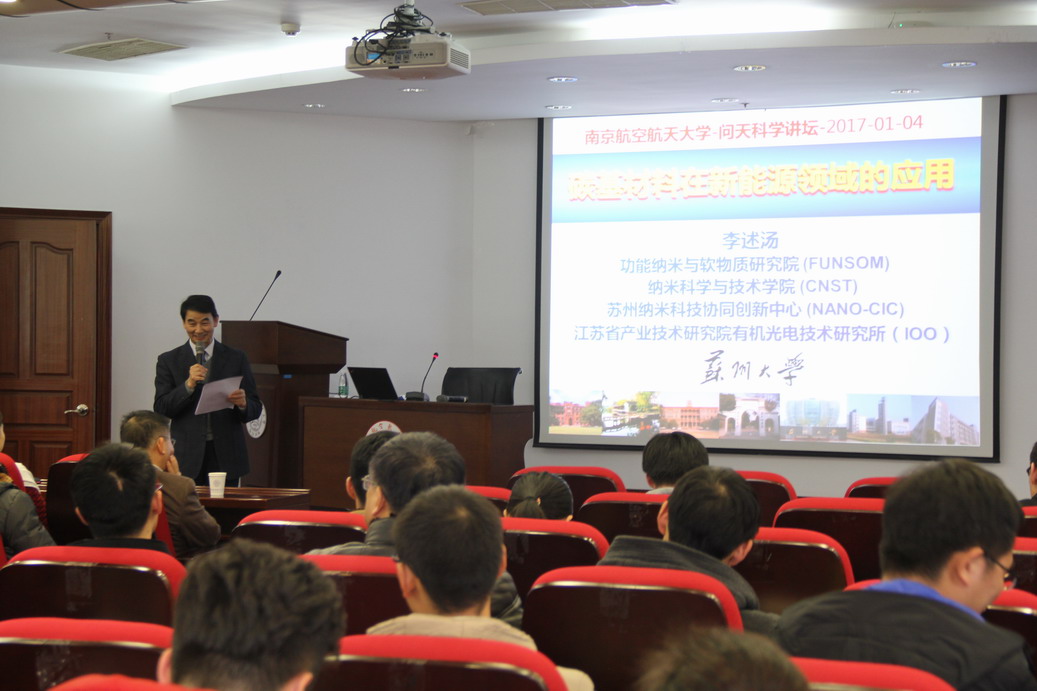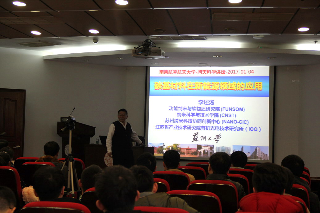 应公司机械结构力学及控制国家重点实验室郭万林教授邀请,材料学家、中国科学院院士、苏州大学李述汤教授于2017年1月4日至5日访问了公司,并于1月4日为公司师生做了题为“碳基材料在新能源领域的应用”的学术报告。李述汤院士讲述了他做有机白光OLED照明的历程,从最初的动机到如何克服一个个的困难,到最后做出在全世界领先的产品。报告会上,李院士激情澎湃、斗志昂扬的精神深深激励了在座的师生。郭万林教授主持了报告会。