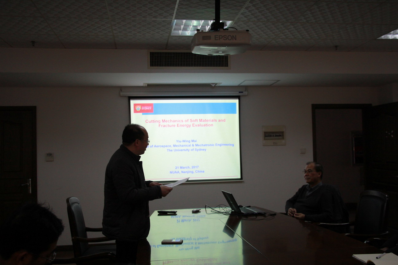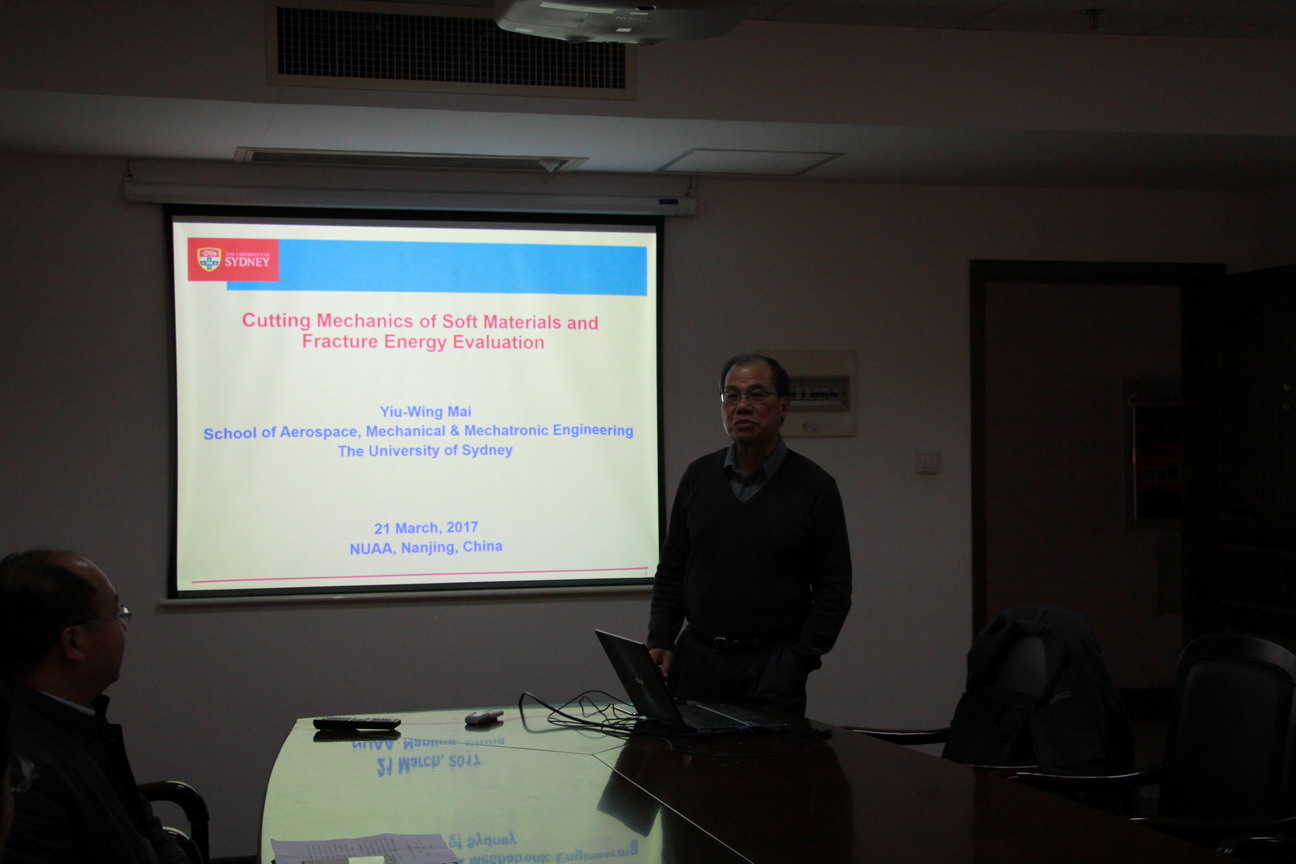 应公司机械结构力学及控制国家重点实验室高存法教授邀请,公司名誉教授、澳大利亚联邦杰出学者、澳大利亚科学院和工程院两院院士、英国皇家科学院和工程院两院院士、澳大利亚悉尼大学航空航天与机械机电工程学院Yiu-Wing Mai(米耀荣)教授及Hong-Yuan Liu博士于2017年3月20日至30日访问了公司,并分别于3月21日、3月29日为公司师生做题为“Cutting Mechanics of Soft Materials � The Role of Fracture Toughness”及“Carbon fibre/epoxy composites toughening by interleaves”的学术报告。报告内容丰富、生动、精彩,分别介绍了断裂韧性在软物质切割力学中的作用及在聚合物复合材料加工制造中的应用,以及采用短纤维薄膜、碳纳米管薄膜等增韧层对碳纤维复合材料结构进行增韧以提高其层间断裂韧性的研究进展,对公司相关科研工作具有非常大的借鉴作用。王立峰教授主持了报告。