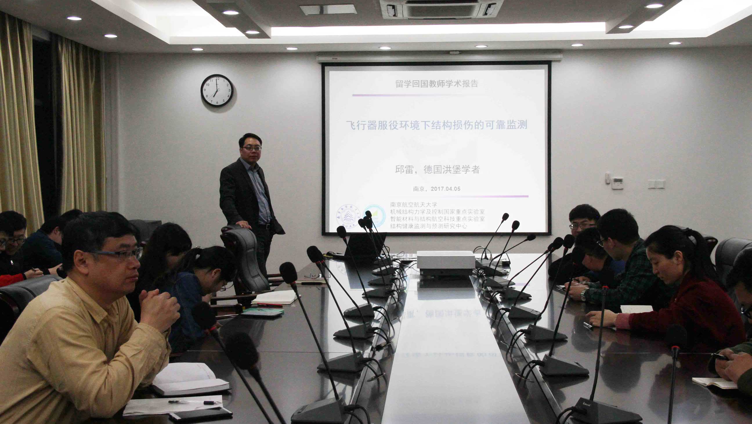 按照校人事处公派留学回国教师的要求,航空宇航学院机械结构力学及控制国家重点实验室邱雷副教授于2017年4月5日为公司师生做了题为“飞行器服役环境下结构损伤的可靠监测”的学术报告。报告介绍了其在德国萨尔布吕肯大学(Saarland University)弗劳恩霍夫无损检测研究所(Fraunhofer IZFP)访问期间所开展的结构健康监测导波的多物理场耦合建模仿真方法和导波受时变环境影响规律的概率混合建模方法的相关研究工作。
