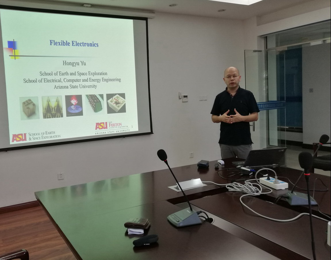 应公司航空宇航学院机械结构力学及控制国家重点实验室吴大伟教授邀请,美国亚利桑那州立大学Hongyu Yu教授于2017年6月9日至16日访问了公司,并于6月13日至14日分别为公司师生做了题为“Smart Structures for Space Exploration”、 “Flexible electronics”、“Film bulk acoustic resonators based sensors”、“MEMS fabrication, devices and applications”系列学术报告。报告内容丰富、生动、精彩,系统的介绍了MEMS技术前沿,MEMS器件在航空航天、医学中前沿应用及MEMS技术未来发展趋势等,对公司相关科研工作具有借鉴作用。吴大伟教授主持了报告会。