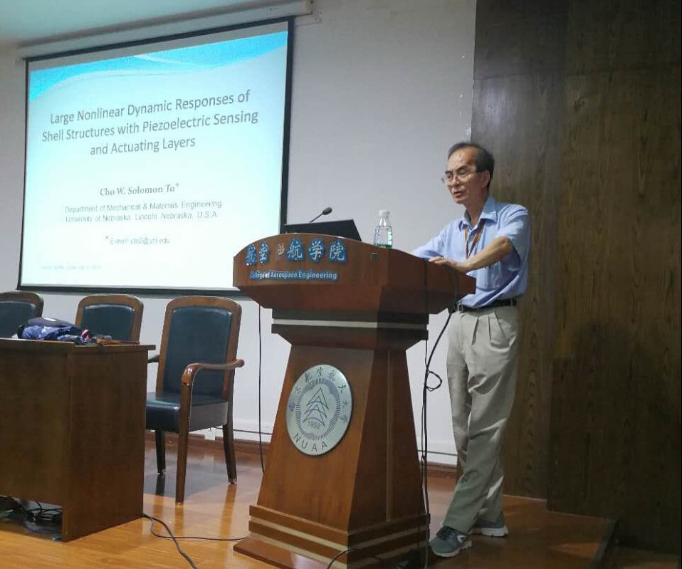 应公司航空宇航学院飞行器先进设计技术国防重点学科实验室张明副教授邀请,美国内布拉斯加大学林肯分校机械与材料工程学院终身教授Cho Wing Solomon To教授,于2017年7月3日至14日访问了公司,并于7月11日为公司师生做了题为“Large Nonlinear Dynamic Responses of Shell Structures with PiezoelectricSensing and Actuating Layers”的学术报告。报告内容丰富、生动、精彩,介绍了含压电传感和作动层壳结构的大非线性动力学响应的有限元求解方法的前沿研究工作,并与部分老师和研究生进行了交流,对公司相关科研工作具有借鉴作用。张明副教授主持了此次报告会。