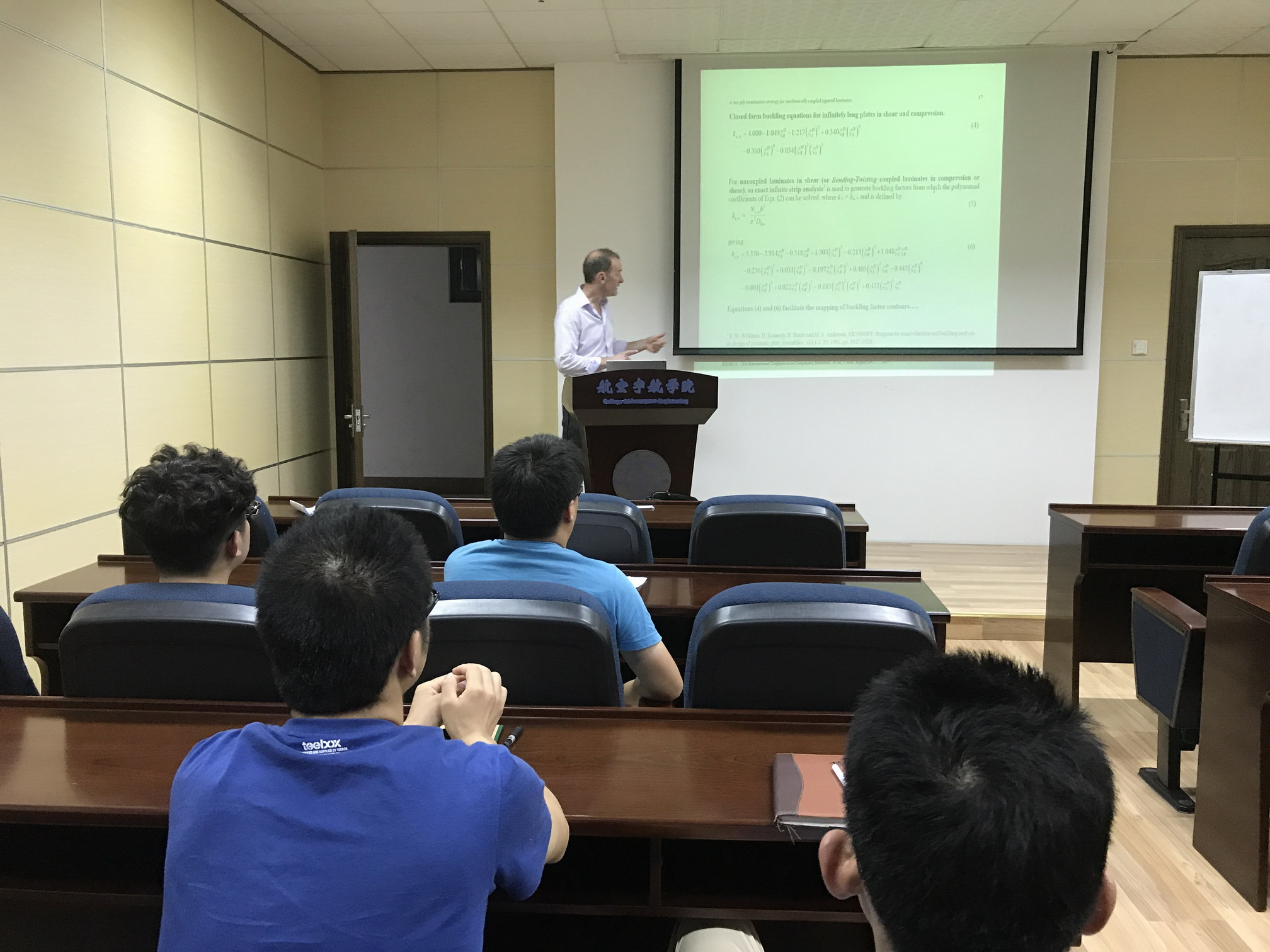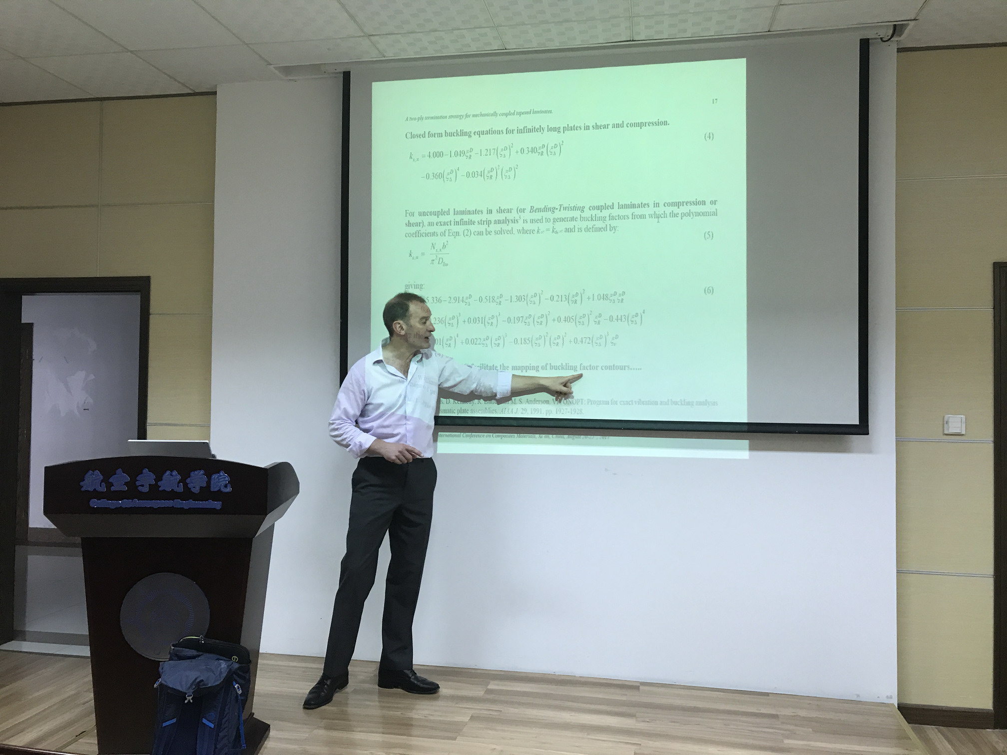 应公司航空宇航学院航空航天交叉研究院郭玉杰老师邀请,英国格拉斯哥大学Christopher Bronn York副教授,于2017年8月21日至9月1日访问了公司,并于8月30日为公司师生做了题为“Effect of bending-twisting coupling on the compression and shear buckling strength of infinitely long plates”的学术报告。报告内容丰富、生动、精彩,介绍了复合材料结构设计中的前沿研究工作,对公司相关科研工作具有借鉴作用。同时,Christopher Bronn York副教授还结合自己多年的研究经历,讲述了复合材料以及复合材料制造技术的发展历史等。郭玉杰老师主持了此次报告会。