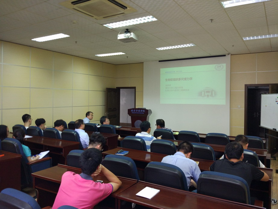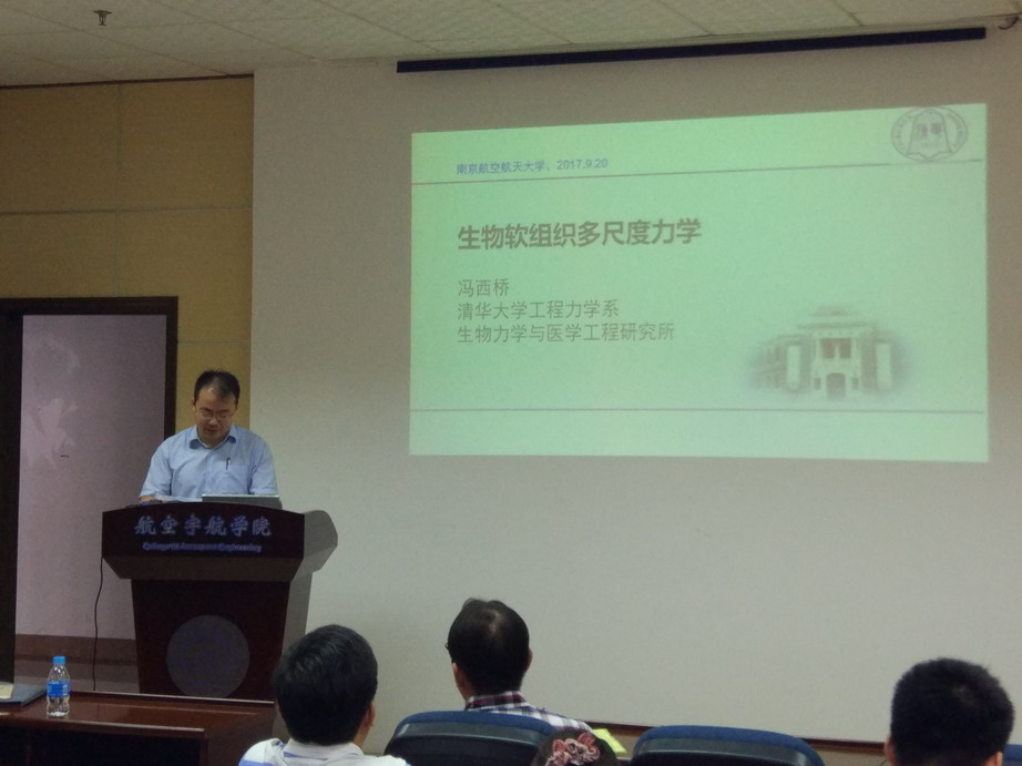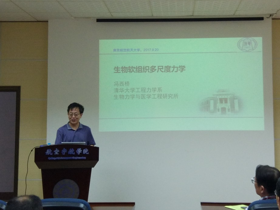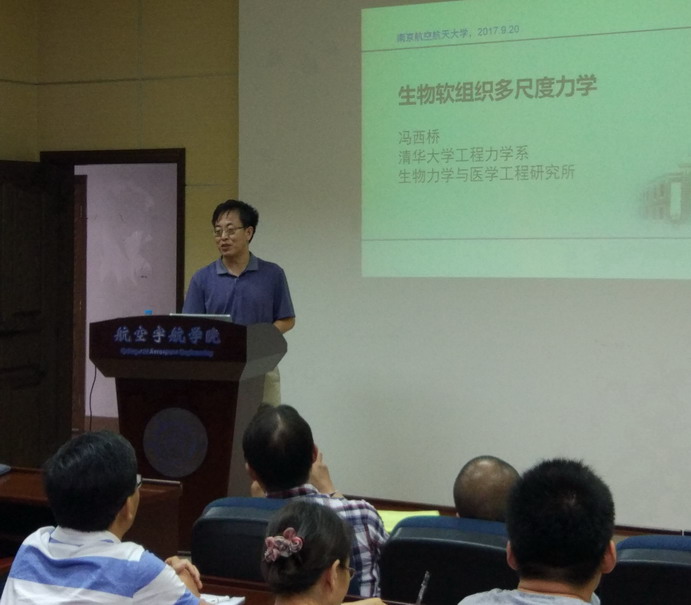 应公司航空宇航学院机械结构力学及控制国家重点实验室高存法教授邀请,清华大学工程力学系主任、生物力学与医学工程研究所所长、长江学者特聘教授冯西桥教授于2017年9月19日至21日访问了公司,并于9月20日下午为公司师生做了题为“生物软组织多尺度力学”的学术报告。报告介绍了在不同尺度上生物软组织力学的若干实验和理论研究进展。在细胞尺度上,通过实验与理论方法探讨了在细胞粘附、分裂、分化等过程中的力学�生物学�化学耦合机制;在多细胞尺度上,利用细胞顶点力学模型与Hopf分叉理论,分析了细胞之间的协同作用效应,揭示了群体细胞发生周期性振荡的机制;在组织层次上,介绍了表征软组织力学性质的压痕、吸管、鼓泡、弹性波成像等实验测量方法,研究生物软组织在生理和病理条件下的表面失稳与形貌演化。此外,还介绍了力学�化学�生物学耦合的肿瘤生长模型以及损伤力学方法在肿瘤中的应用。报告内容丰富、生动、精彩,对公司相关科研工作具有借鉴作用。同时,冯西桥教授还结合自己多年的研究经历,讲述了作为一名力学工作者在新兴的生物力学领域的研究体会,分享了研究心得。钱征华教授主持了此次报告会。