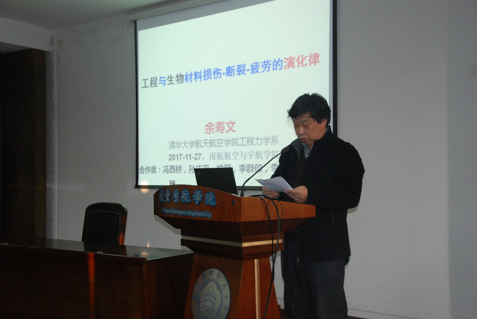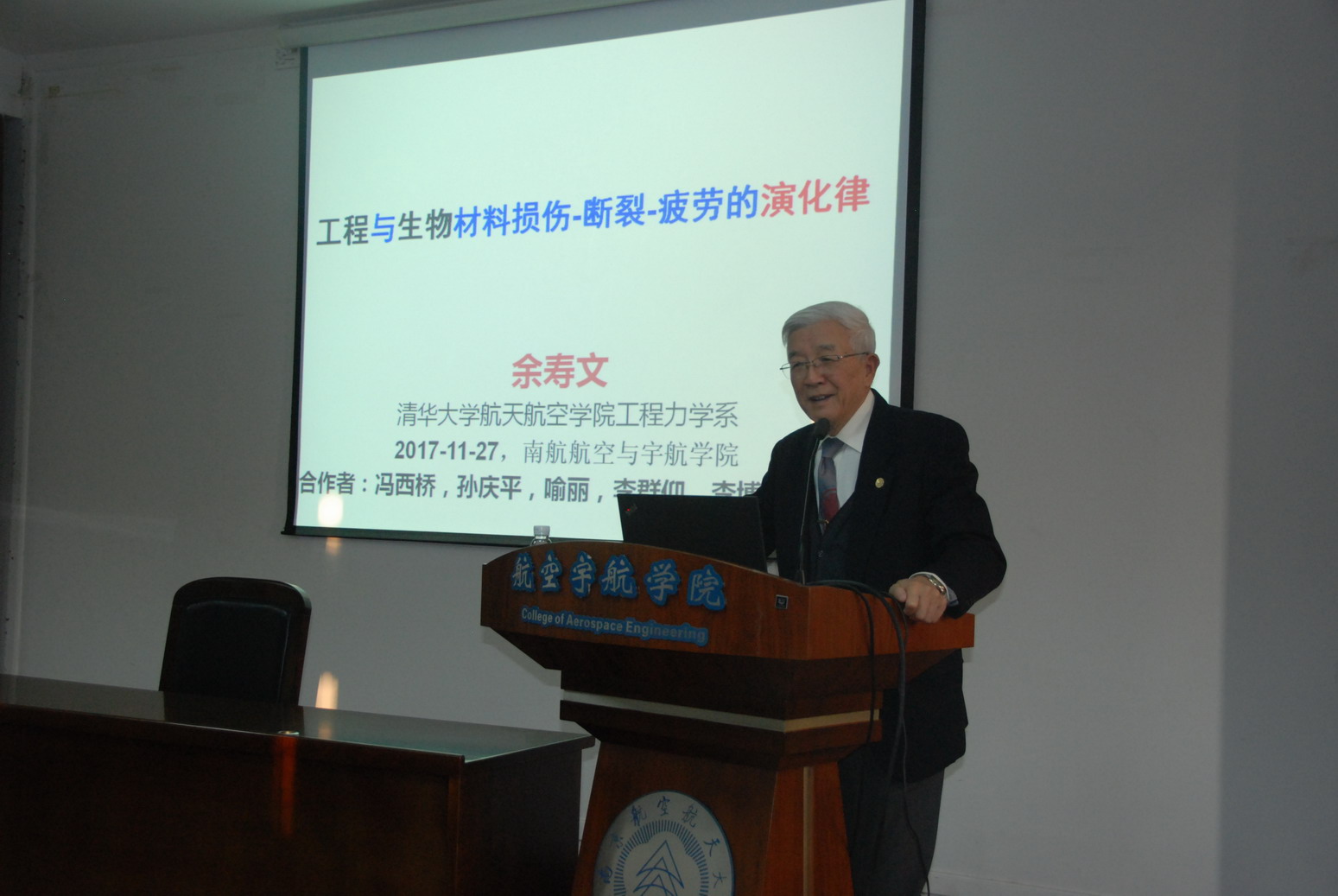 应公司航空宇航学院机械结构力学及控制国家重点实验室高存法教授邀请,清华大学原副董事长余寿文教授于2017年11月27日至29日访问了公司,并于11月27日为公司师生做了题为“工程与生物材料损伤-断裂-疲劳的演化律”的学术报告。报告介绍了包括金属、岩石等传统材料以及生物材料的疲劳失效机理。报告内容丰富、生动、精彩,对公司相关科研工作具有借鉴作用。同时,余寿文教授还结合自己多年的研究经历,与现场听众分享了断裂力学及其与生物力学相结合的研究心得和体会。高存法教授主持了报告会。