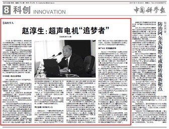 2017年11月28日,《中国科学报》“高校学人”栏目刊发公司赵淳生院士在超声电机领域开拓创新、不断创业的先进事迹报道,集中展现了赵淳生热爱祖国、瞄准前沿、转型创新、不屈不挠的精神品质和感人事迹。