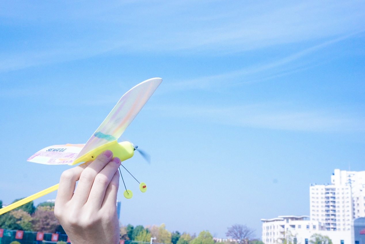 航模飞机制作完毕后,大家说说笑笑地来到西操,围成一排欣赏着每个人飞机上的标志性图案,手持新制作的飞机,轻轻抛向远方,看着飞机在天际翱翔,自己也仿佛插上了梦想的翅膀。