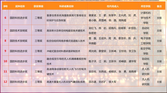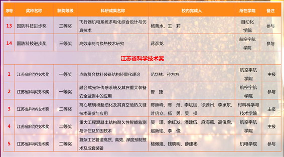 航空宇航学院范华林教授等申报的“点阵复合材料装备结构轻量化理论”获江苏省科学技术一等奖,航空宇航学院曾捷副教授等参与的“融合式光纤传感系统及其在重大装备安全监测中的应用”获江苏省科学技术一等奖。