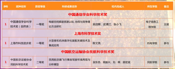 2017年公司电子信息工程学院吴启晖教授等申报的“电磁空间频谱资源认知、协同与竞争理论方法研究”获中国通信学会科学技术一等奖(自然类)。机电学院陈文亮教授等参与申报的“大型客机机体数字化装配关键技术及集成应用”获上海市科技进步一等奖。