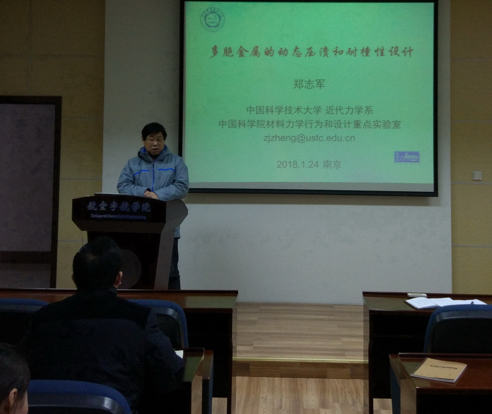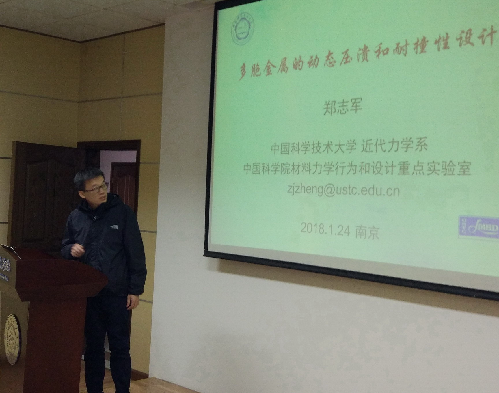 应公司航空宇航学院机械结构力学及控制国家重点实验室高存法教授邀请,中国科学技术大学郑志军副教授于2018年1月24日访问公司,并为公司师生做了题为“多胞金属的动态压溃和耐撞性设计”的学术报告。报告介绍了一系列可描述多胞材料动态压溃的细观有限元模型和一维冲击波模型,以及局部应变场计算方法,并揭示了多胞金属率敏感性机理和能量吸收机理。报告内容丰富、生动、精彩,对公司相关科研工作具有借鉴作用。同时,郑志军副教授还结合自己多年的研究经历,与现场听众分享了吸能材料领域的研究心得和体会。高存法教授主持了报告会。