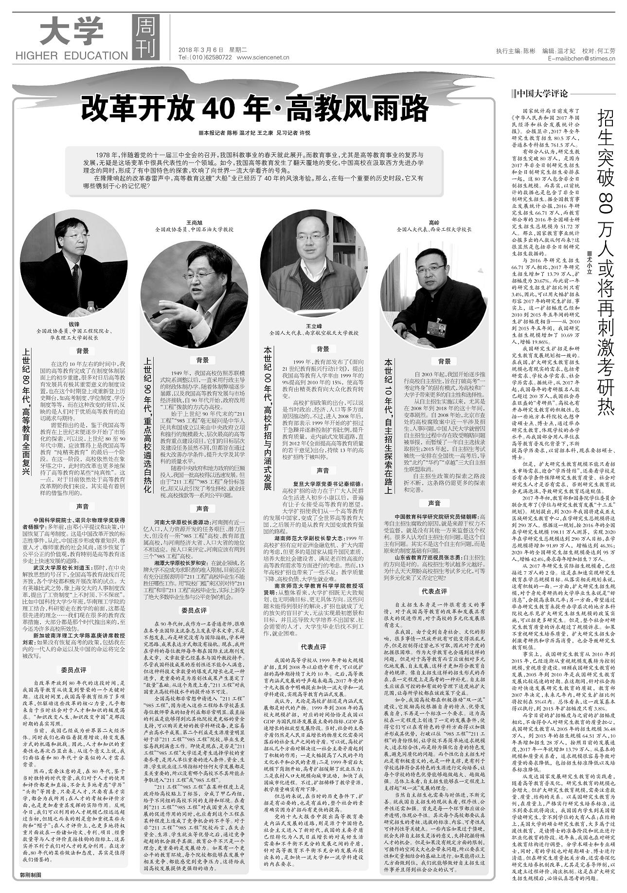 3月6日,《中国科学报》大学周刊两会特别报道之“改革开放40年・高教风雨路”,围绕高等教育40年的发展,对四位来自高校的人大代表、政协委员就行了专版报道,全国人大代表、公司航空宇航学院教授王立峰就高校扩招与内涵式发展进行了点评。