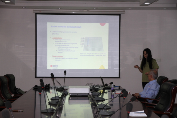 Akbar Khatibi教授的报告介绍了在多功能复合材料领域的最新进展,通过在传统复合材料中集成入微密封的相变材料使之具有热管理功能,实验研究给出了不同组份的相变材料对复合材料多种力学性能的影响。赵静雯的报告介绍了在声学超材料领域的最新进展,采用数值方法对水状介质中具有非周期性、非线性结构的声学超材料进行了模拟以研究设计参数对其性能的影响。报告内容丰富、精彩生动,对公司相关科研工作具有借鉴作用。同时,Akbar Khatibi教授还结合自己多年的研究经历,与现场听众分享了多功能复合材料、声学超材料的研究心得和体会。裘进浩教授、孙慧玉教授、王婧副教授、严康副教授、蔡登安老师出席了报告会。