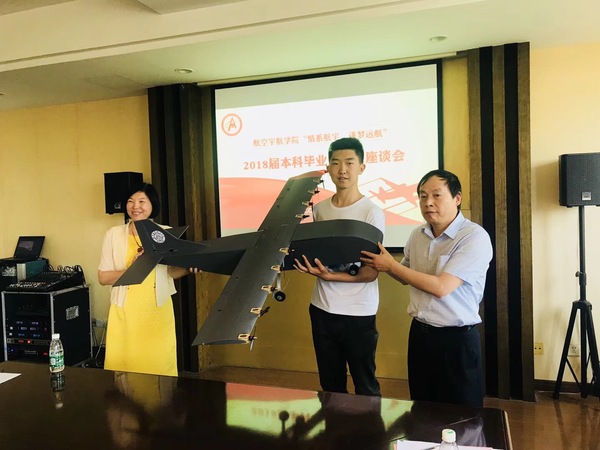 毕业生献礼环节将座谈会的热烈氛围推向高潮,毕业生代表捧出三件“特殊的礼物”:飞设专业毕设最高分获得者的航模作品、土木工程专业毕设最高分获得者的工程图纸和毕业生签名的原创文化衫,夏经理和冯书记代表学院接受了献礼并表达了对全体毕业生的感谢。