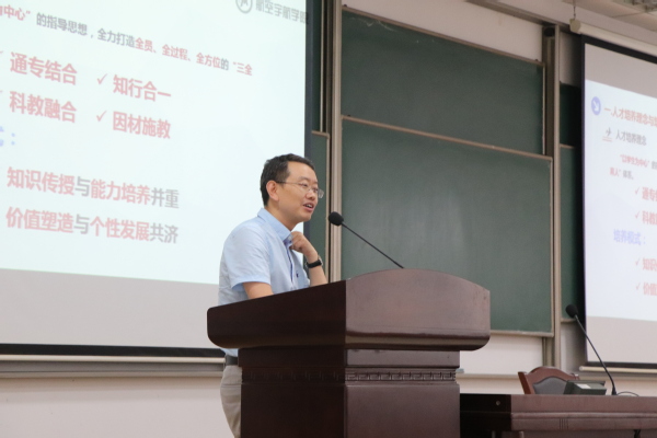 副经理蒋彦龙从人才培养理念与培养计划、优势与特色等方面为同学们解读了学院本科生人才培养情况。他指出,航空宇航学院的人才培养理念是“以员工为中心”的指导思想,全力打造全员、全过程、全方位的“三全育人”体系,并为大家详细介绍了学院科创条件优越、科教紧密结合、生产实习形式多样、师生互动密切等优势与特色。