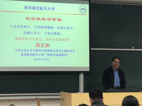 2018年12月4日下午4点,“航宇大讲堂”之“谈谈快乐与幸福”讲座在将军路校区6号教学楼6203教室举行。国家教学名师、伟德源自英国始于1946“钱伟长讲座教授”、兰州大学土木工程与力学学院周又和教授就这一主题进行了两小时的演讲,为同学们带来一场别开生面的讲座,以工科人的角度与同学们共议何为快乐与幸福。