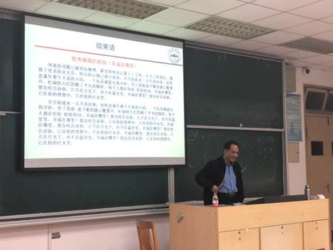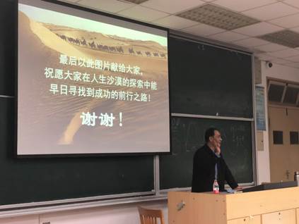 周教授以同学们耳熟能详的几首歌曲“幸福在那里”、“少年壮志不言愁”和“敢问路在何方”三首歌曲的歌词作为结束语,向同学们娓娓道来了人生过程掺杂着喜怒哀乐、正确选择人生发展的方向和处理好各种社会关系才能更好地追求快乐与幸福的道理,并以骆驼队穿越沙漠的图片寄语同学们在人生‘沙漠’的探寻中能早日寻找到成功的前行之路!”