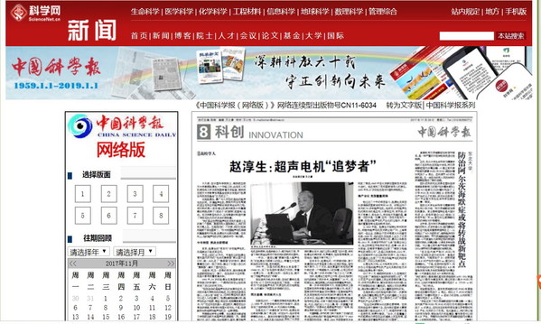 2017年11月28日,《中国科学报》“高校学人”栏目刊发我所赵淳生院士在超声电机领域开拓创新、不断创业的先进事迹报道,集中展现了赵淳生热爱祖国、瞄准前沿、转型创新、不屈不挠的精神品质和感人事迹。