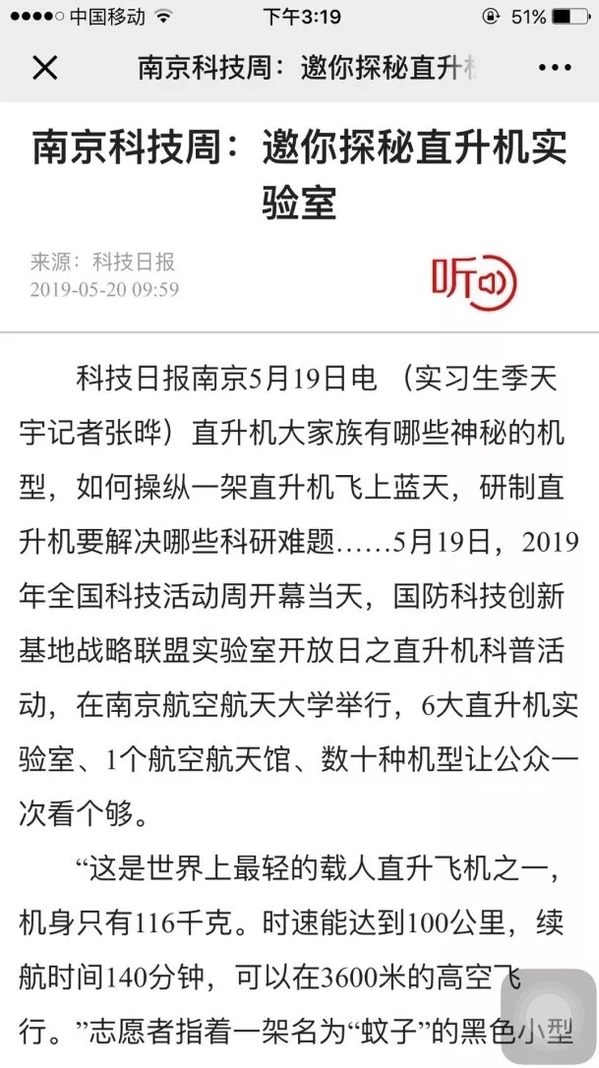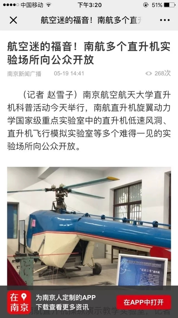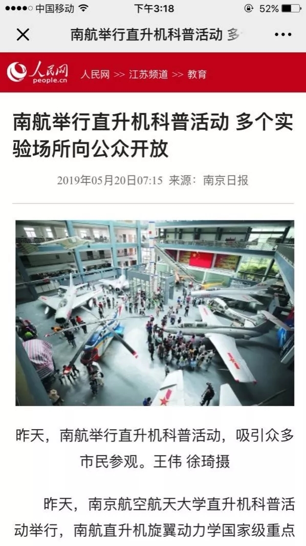 位于南航校园内的南京航空航天馆是现场最热闹的展馆,各类飞行器的展示吸引了大批观众,更有附近中小学组织的统一参观。讲解员为参观者一一讲解了各个飞行器的研究历程、性能及特点等,并对参观者的提问进行了详细解答。在操纵演示教学实验室,直升机系系主任高亚东为参观者生动而形象地介绍了旋翼机和直升机的区别。不少参观者对这次实验室开放活动表示赞赏与支持:从事雷达制造与研究的李女士表示:“这次活动让孩子对旋翼等直升机部件有了直观性的认识,帮助孩子了解到父母从事的工作究竟是什么样子的。”另一位家长表示:“这个活动一方面展示了南航在科研方面卓越研究能力,同时也更好的服务了社会,进行科普教育,展示了国家级重点实验室的风采。”