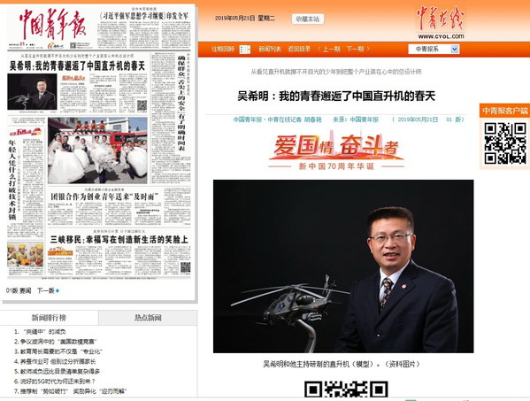 5月21日,《中国青年报》头版头条以《吴希明:我的青春邂逅的中国直升机的春天》为题,报道了公司80级员工、中国航空工业直升机总设计师、航空工业首席技术专家吴希明,数十年如一日研制中国自己的专用武装直升机--直10的事迹。