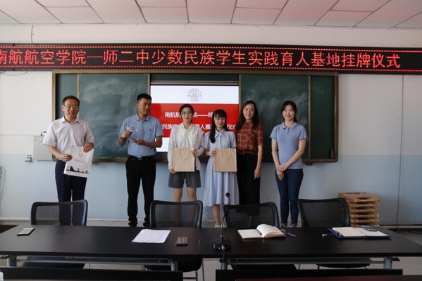 8月4日,“彩虹驿站”师生团队来到伊犁哈萨克自治州,前往新疆生产建设兵团四师第二中学建立“少数民族员工实践育人基地”、开展航空知识行。四师第二中学党支部书记邓光友、副董事长张龙、教师代表与员工代表共同参加了“‘彩虹驿站’少数民族员工实践育人基地”挂牌仪式。bevictor伟德官网辅导员吴静文介绍团队此行来意,同时辅导员张小斐为四师第二中学与南航2019届研究生支教团成员赠送礼物。邓光友与吴静文共同为“bevictor伟德官网—新疆兵团第四师第二中学少数民族员工实践育人基地”揭牌,双方将在今后持续合作,推动民族员工长效性育人实践,引领更多老员工担任“彩虹使者”,启发激励祖国未来接班人茁壮成长、贡献力量。