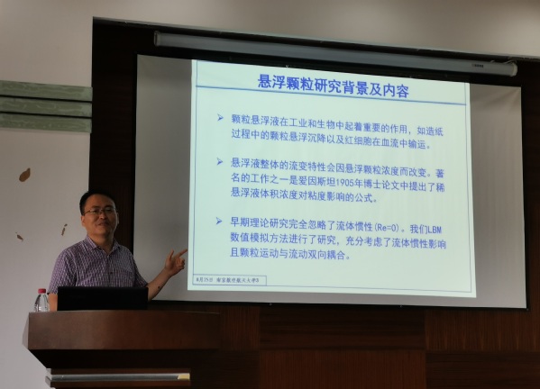 报告介绍了悬浮椭球颗粒在Couette流、Poiseuille流中的转动,以及圆管中椭球颗粒的沉降运动的数值模拟方法和流-固耦合机理。报告内容丰富、精彩生动,报告会由王岩教授主持。会后,黄海波教授与公司孙建红教授、陈红全教授等师生做了深入的交流和探讨及补充和解答。